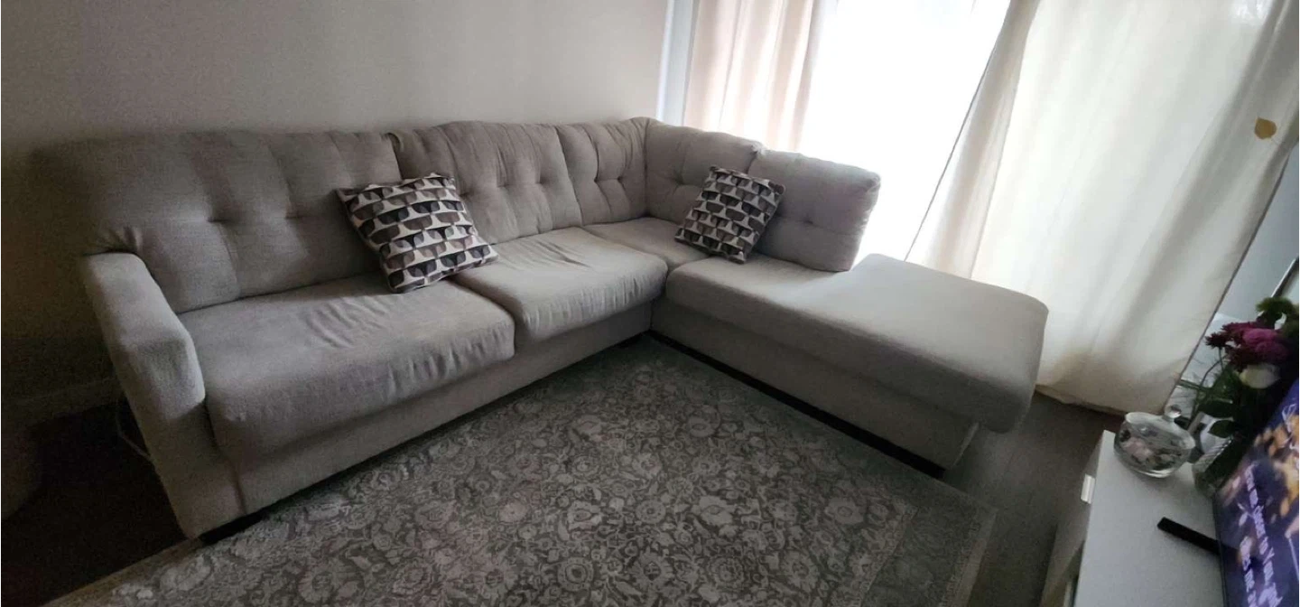 Selling a comfortable sectional sofa with an ottoman. It's in great condition and would be perfect for a living room or entertainment space. The neutral colour will fit with any decor. Comes with two decorative pillows and rug.