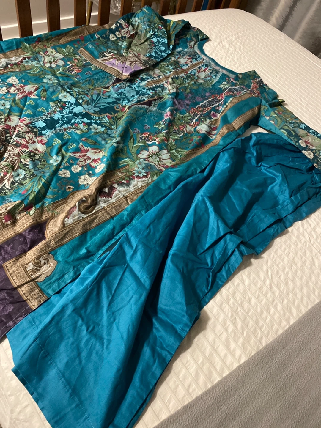 Selling a beautiful shalwar kameez with a lovely floral pattern in shades of teal and purple. It's in great condition and ready for a new home! Perfect for a special occasion or just adding some colour to your wardrobe