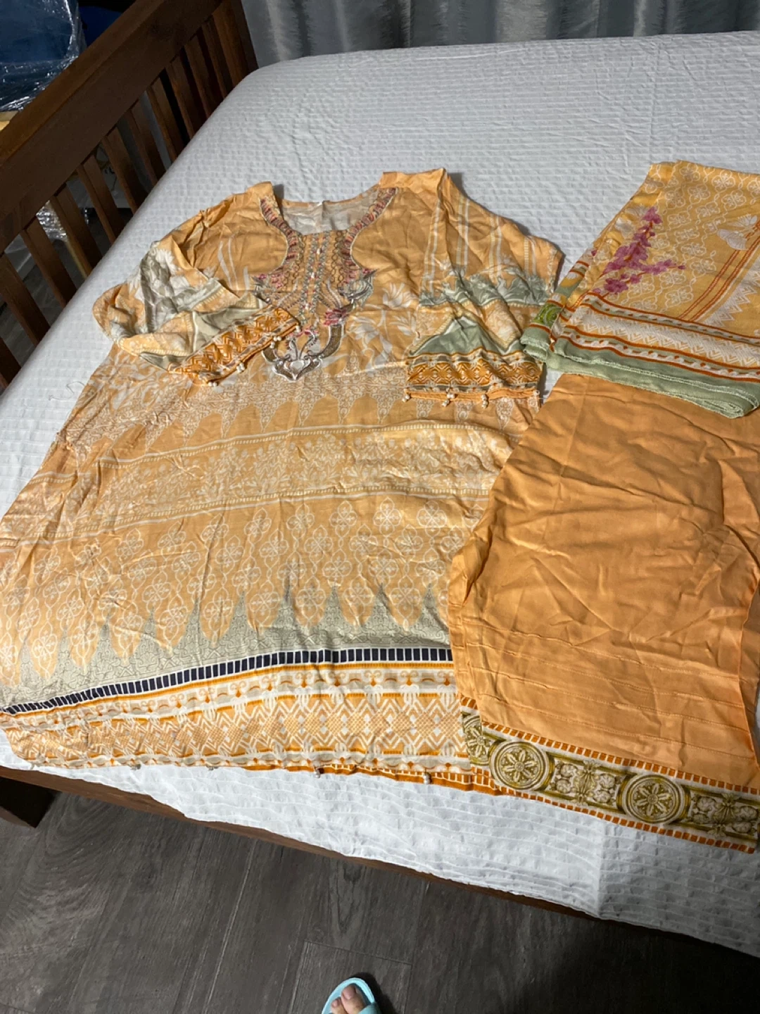 Selling a lovely orange salwar kameez suit. It features a beautiful design and comes with both the top and pants. Perfect for a special occasion or everyday wear! Never worn