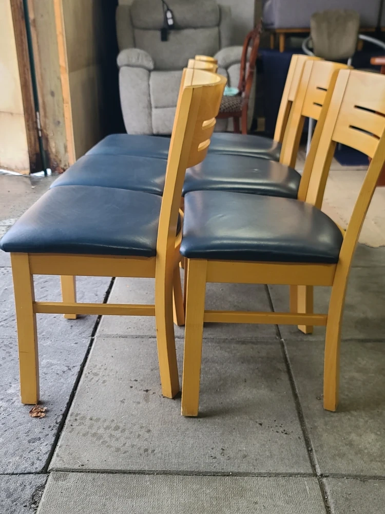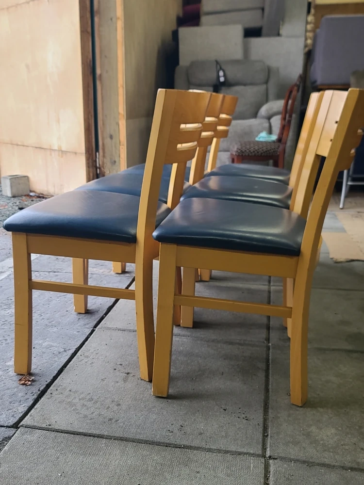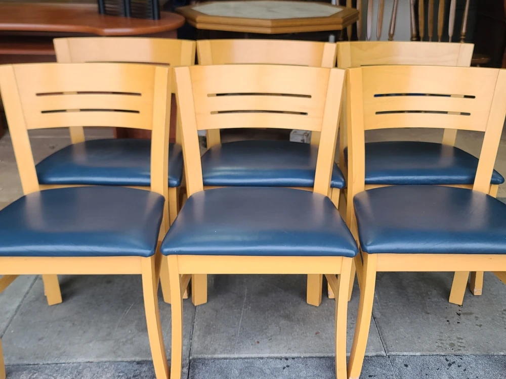 A lovely set of six sturdy wooden chairs with comfortable blue seats. They're perfect for a dining room or kitchen! They're in great shape and ready for a new home. Measurements to follow. Delivery can be arranged. Viewing and pickup by appointment.