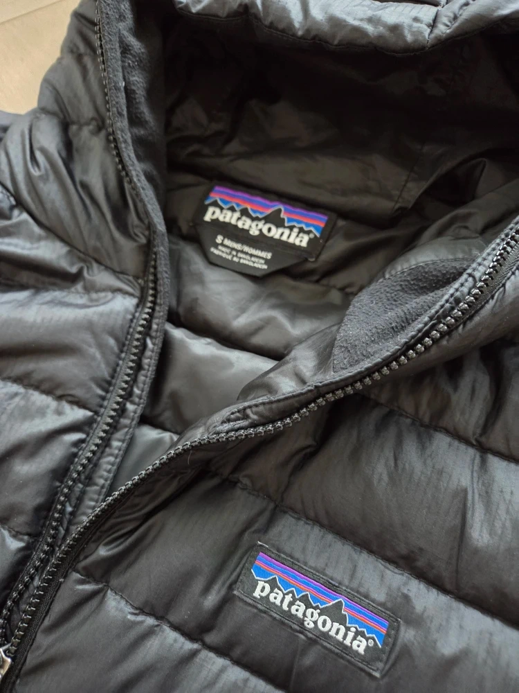 Selling a Patagonia down puffer jacket in size small. It's in great condition and ready to keep you warm this winter! The jacket is black and features the classic Patagonia logo.