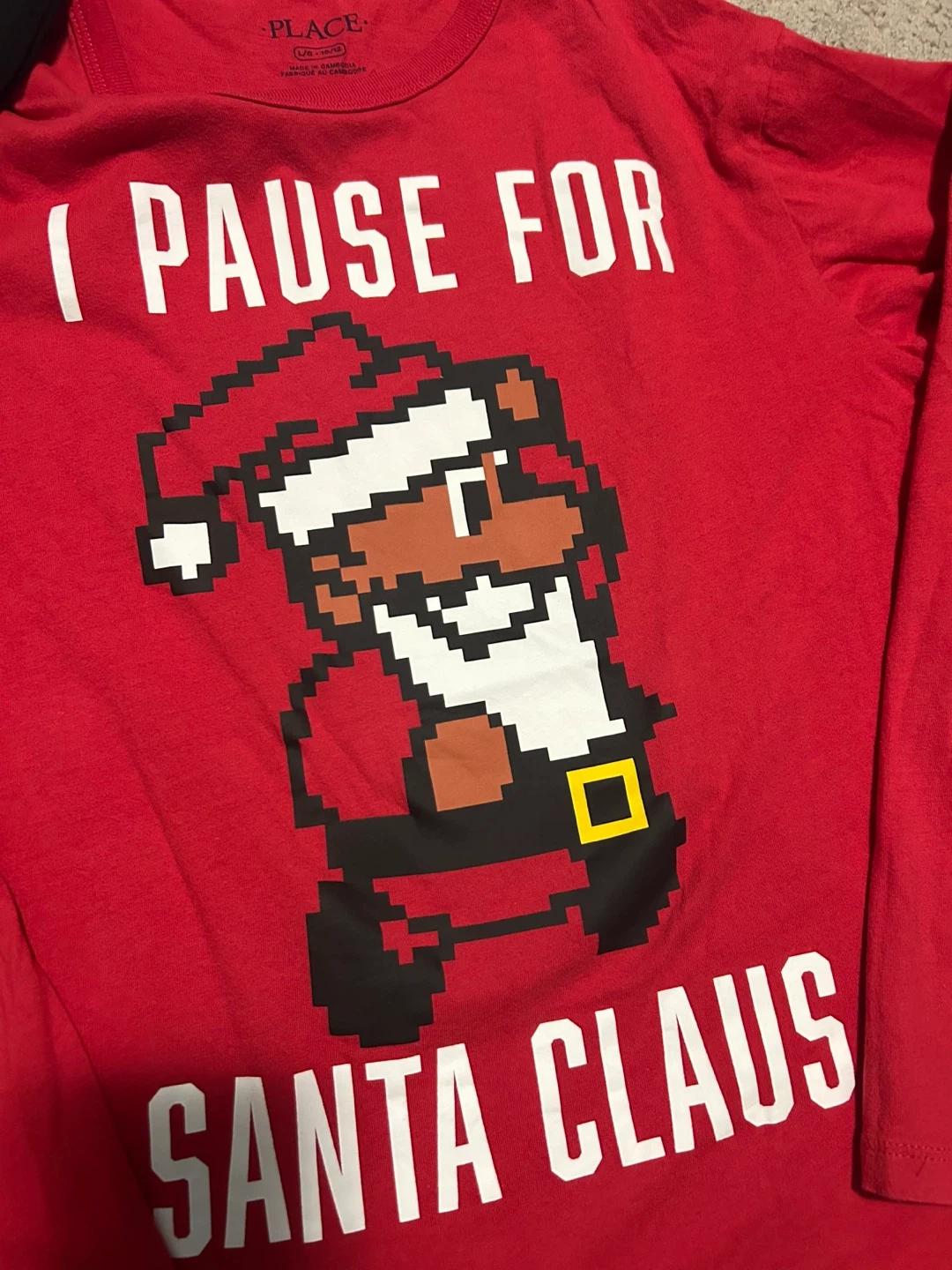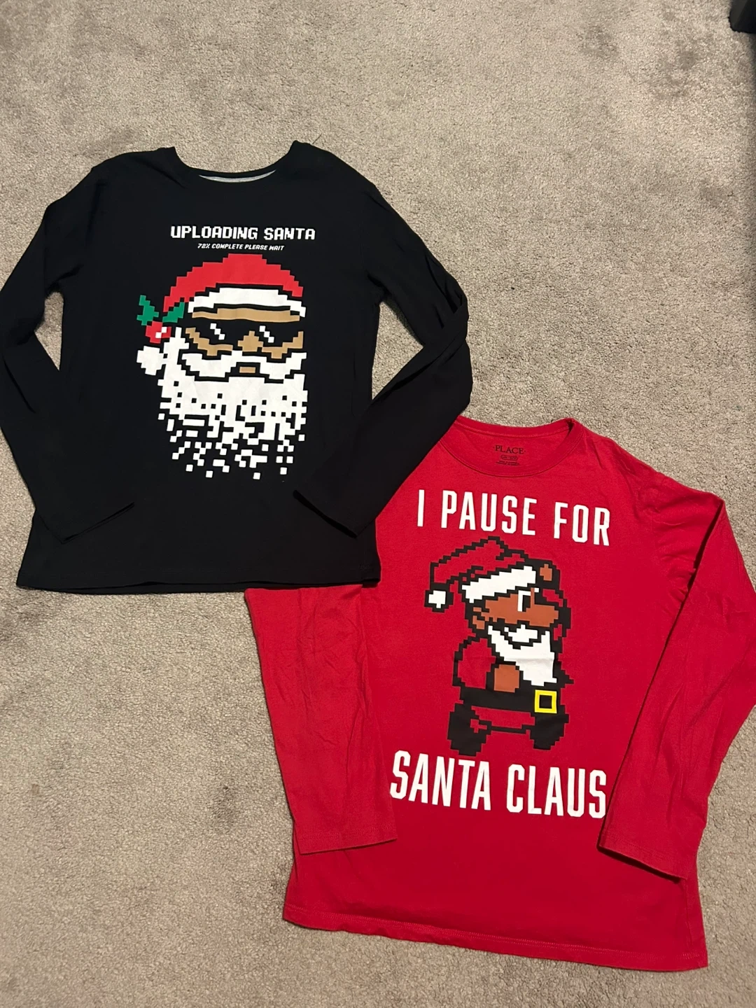 Two long-sleeved shirts with fun Christmas Santa graphics!