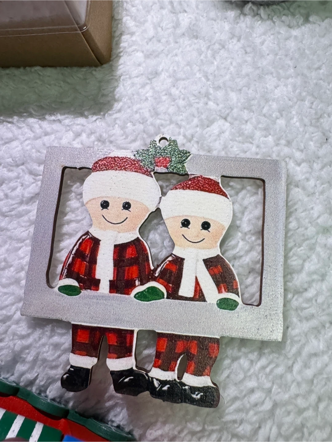 Here's a cute, handmade wooden Christmas ornament of a family wearing Santa hats and plaid pyjamas! Perfect for your Christmas tree or as a festive decoration around the house
