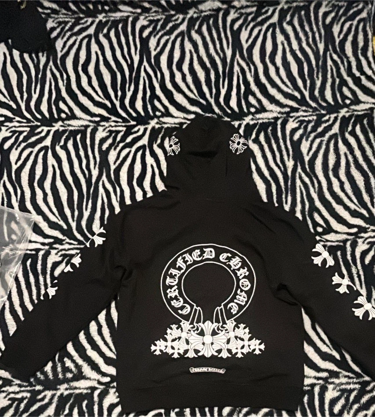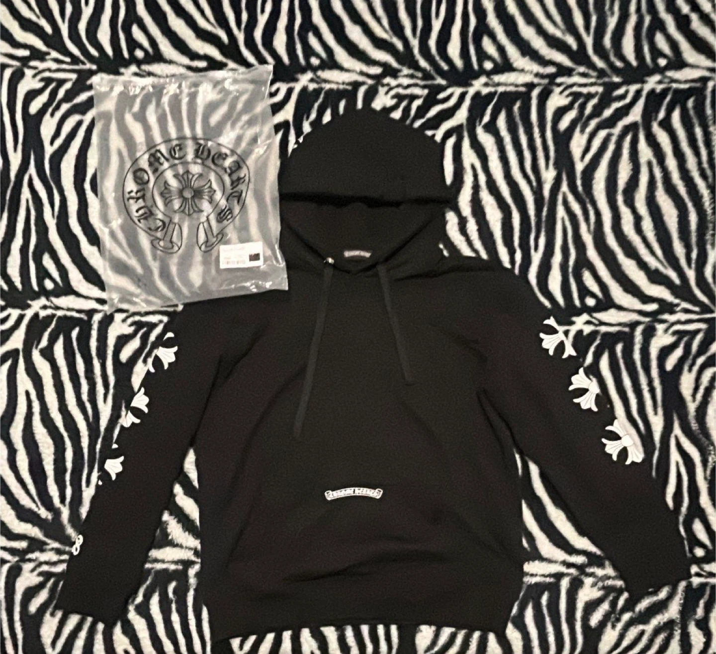 Selling a Chrome Hearts black hoodie. It has the signature Chrome Hearts design on the sleeves and back. Perfect for adding a bit of edge to your wardrobe!