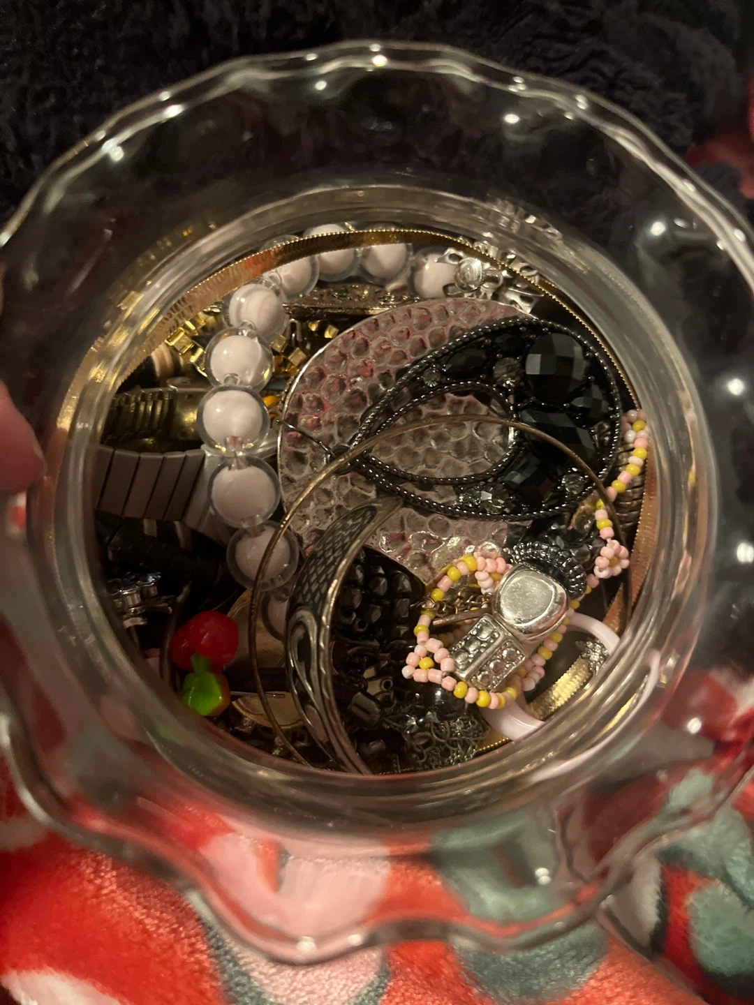 Selling a jar filled with assorted jewellery. Perfect for anyone who loves to accessorize or is looking for unique pieces to add to their collection! There's a variety of styles and colours in the mix, ready for a new home.