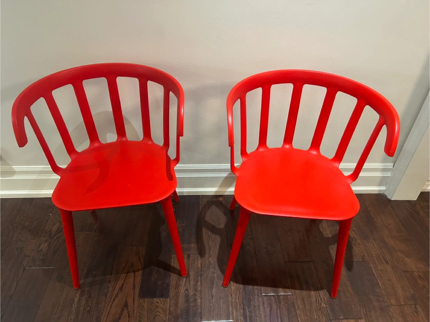 Selling a set of two IKEA PS 2012 Marcus arvonen chairs red plastic chairs. They're in good condition and would be great for indoor or outdoor use