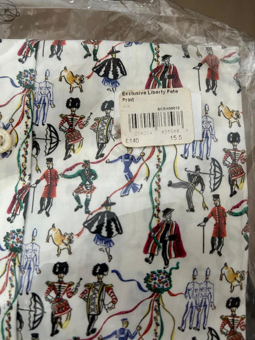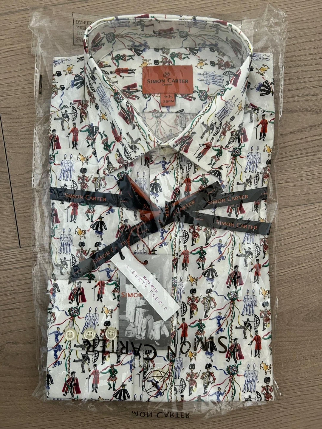 This is a Simon Carter London shirt in size 15 1/2 (39cm). It features an exclusive Liberty Fete print and is made with Liberty fabric. Originally bought for £140!