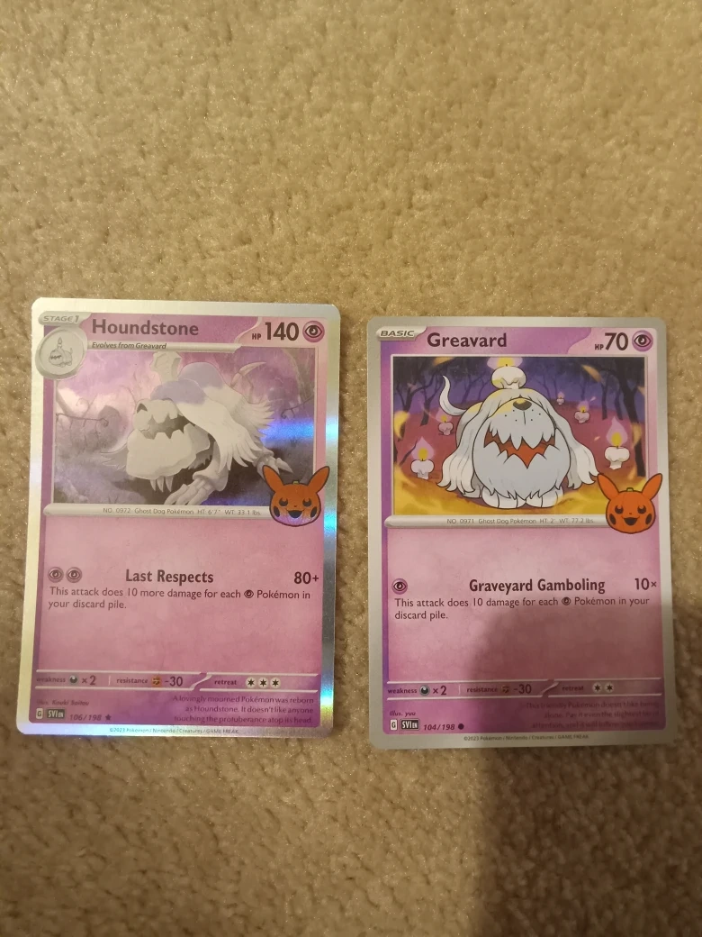Selling two Pokemon cards: Houndstone and Greavard! Both cards are in great shape and ready for a new home. Perfect for any Pokemon card collector
