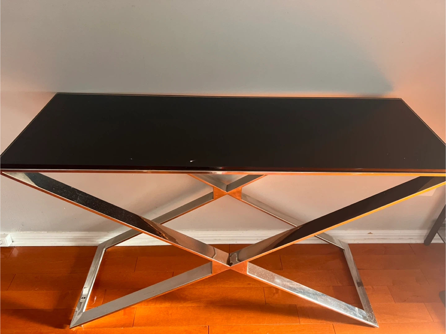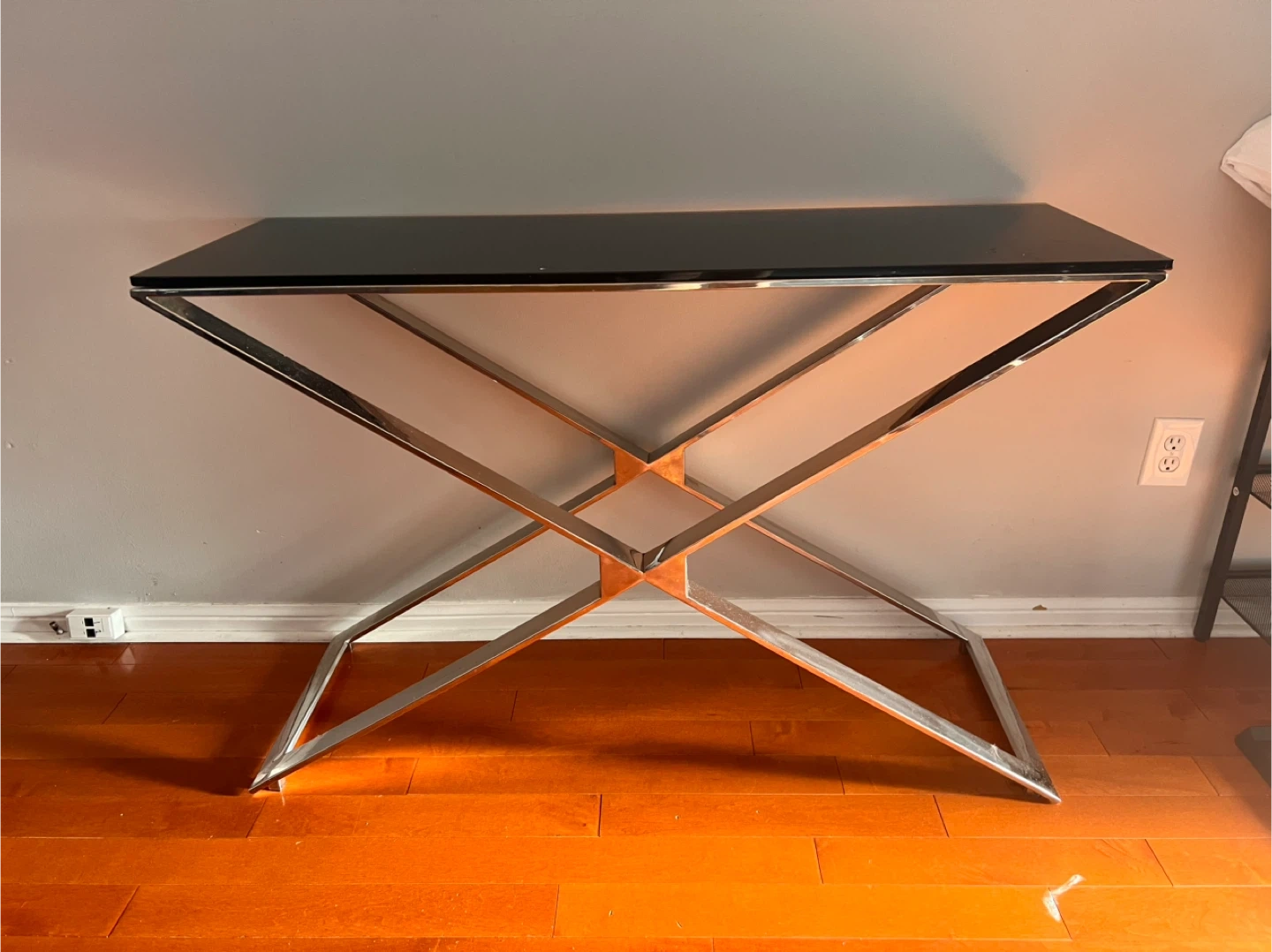 Selling a stylish console table with a black glass top and a chrome base. It's in great shape and would look fantastic in any entryway or living room. The modern design adds a touch of elegance to your home decor!