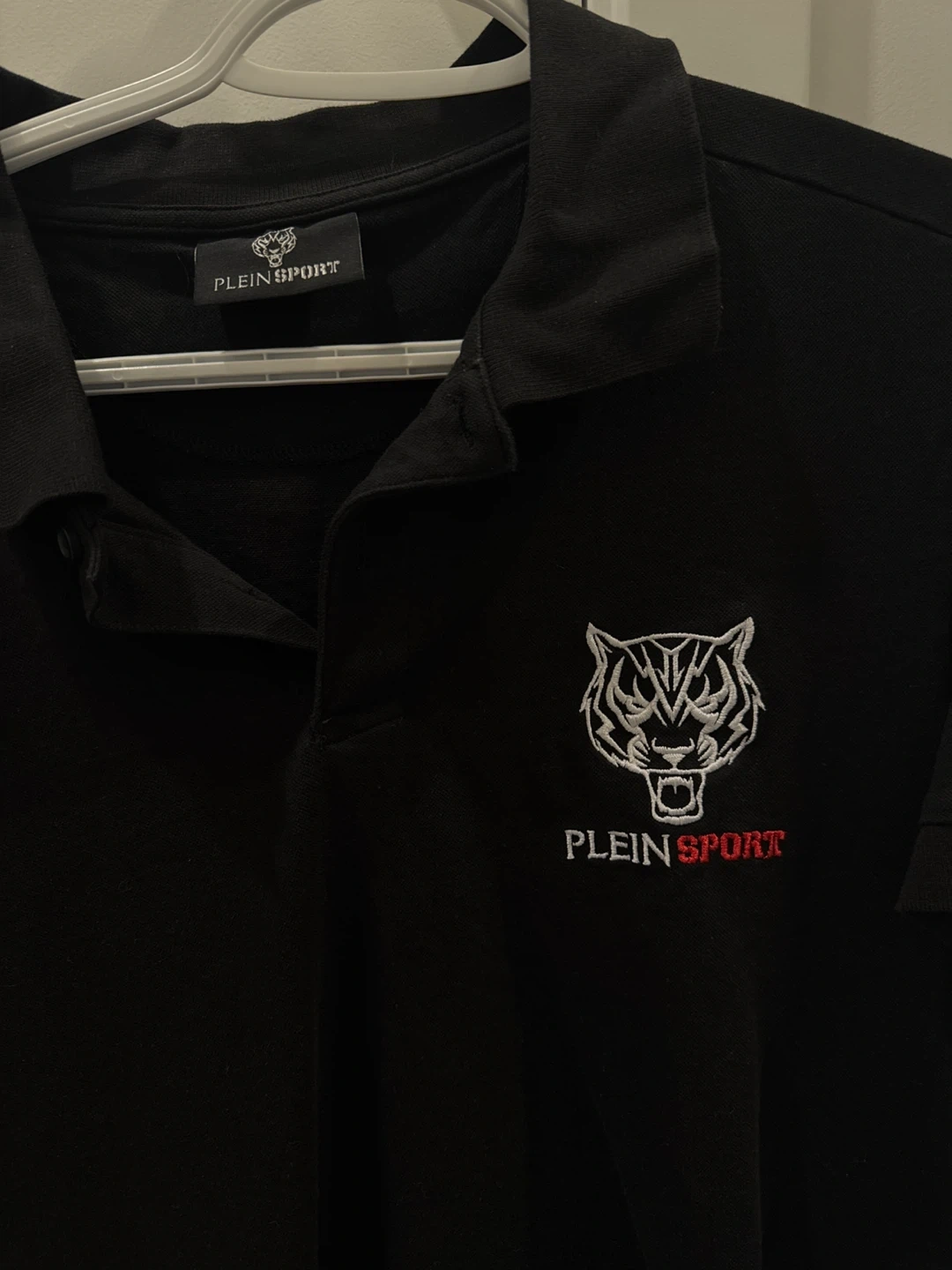 Selling a black Plein Sport polo shirt! It features a cool tiger design and the brand name embroidered on the front. Perfect for a casual yet stylish look