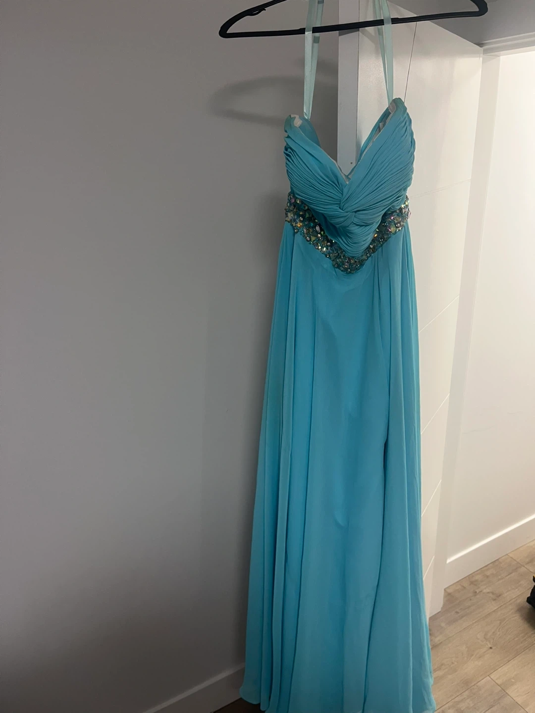 Selling a lovely turquoise formal dress! It features a beautiful beaded waistline and a flowing design. also has a slit.