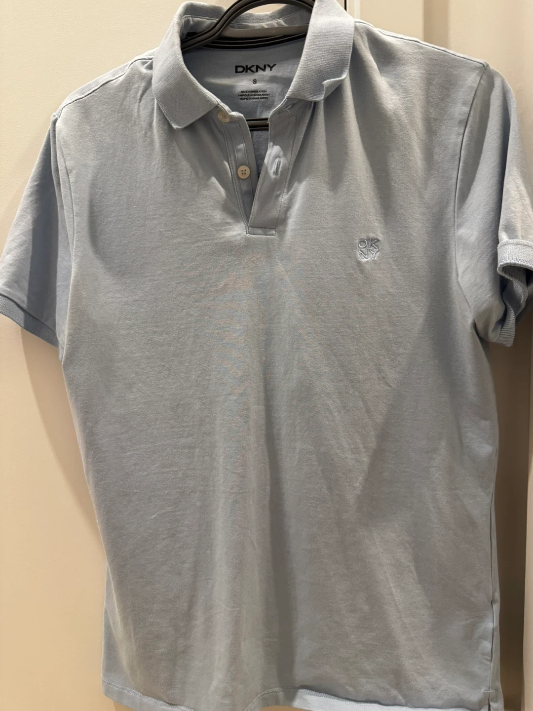 Here's a DKNY polo shirt in a light blue color! It's a size small. Perfect for casual wear, this polo is a stylish and comfortable addition to your wardrobe