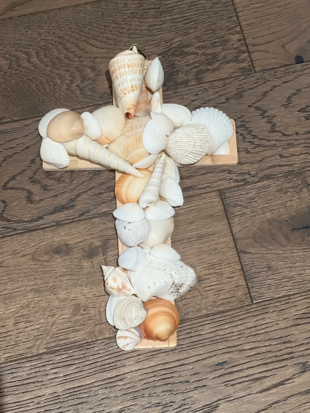 A unique seashell cross decoration for your home! It's made with a variety of beautiful seashells, perfect for adding a touch of coastal charm to any room