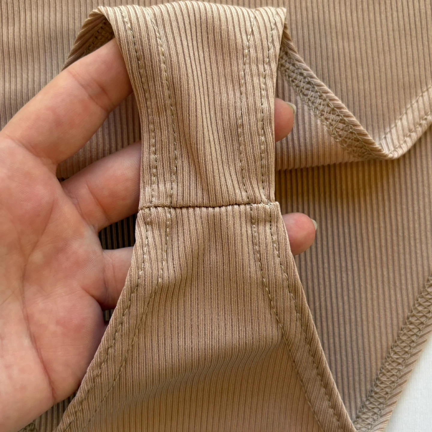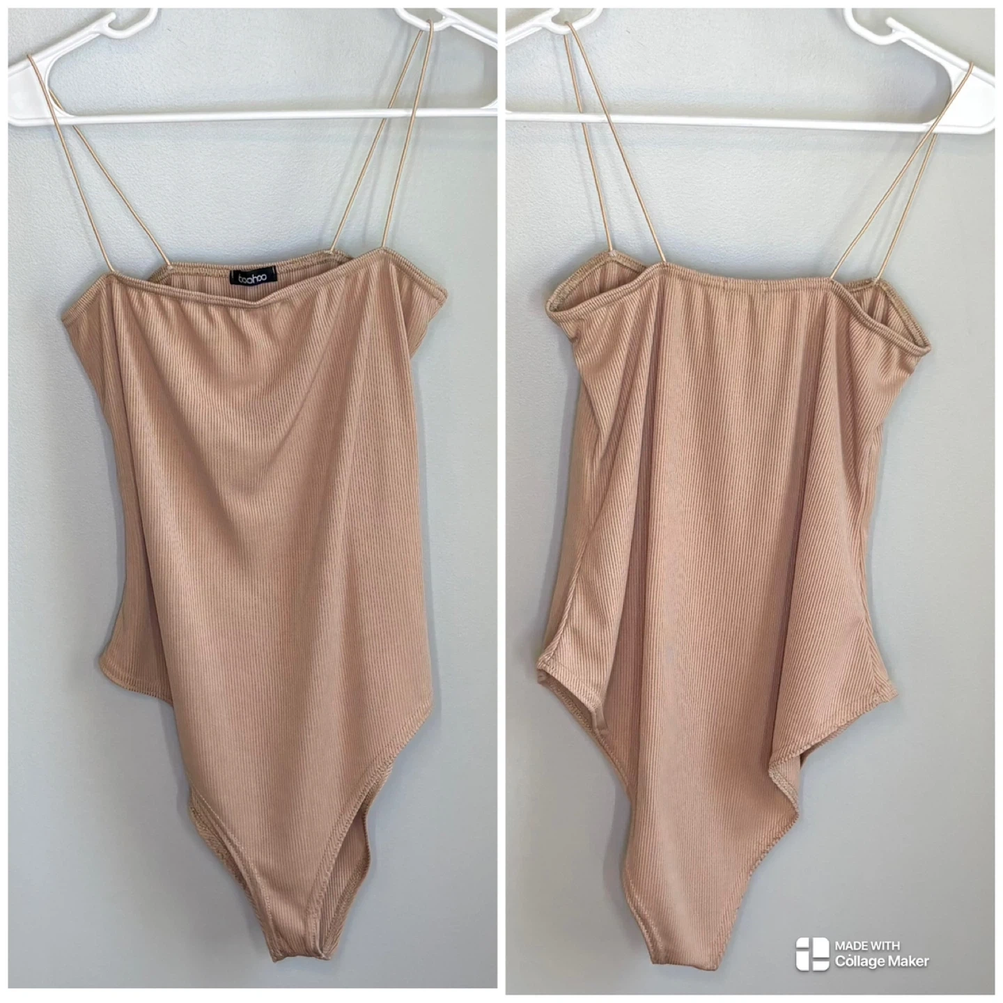 Boohoo, bodysuit, ribbed, knit, square neck, cami, skinny strap, nude, tan, stone, fitted, stretchy, layering, minimalist, casual, summer, spring