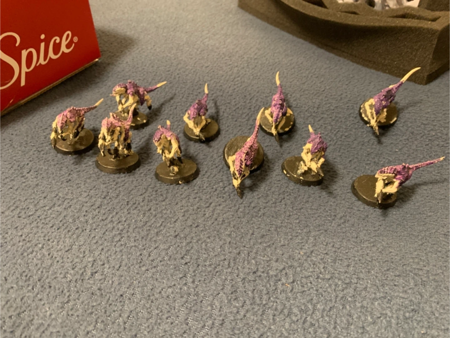 Selling a set of 10 Warhammer termagaunts. They are already painted and ready for your tabletop battles! Perfect for Warhammer 40k enthusiasts! 2$ each or 20$ for all
