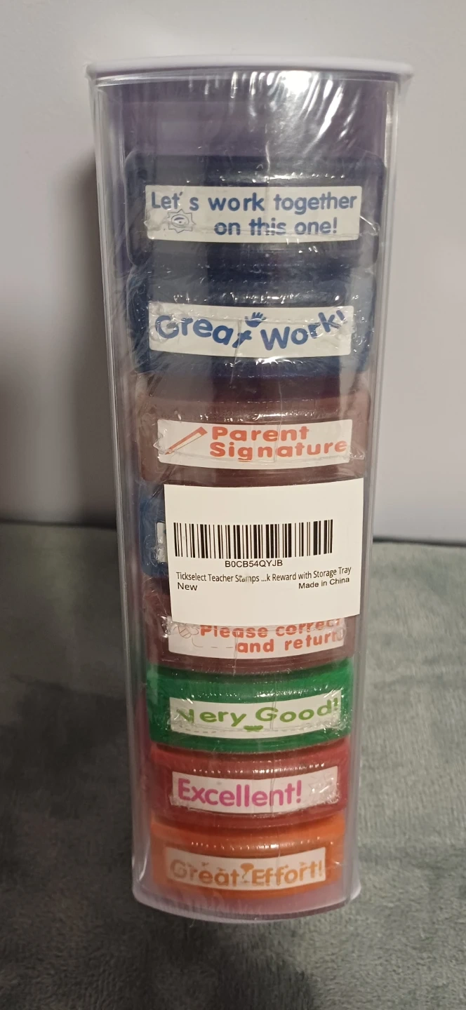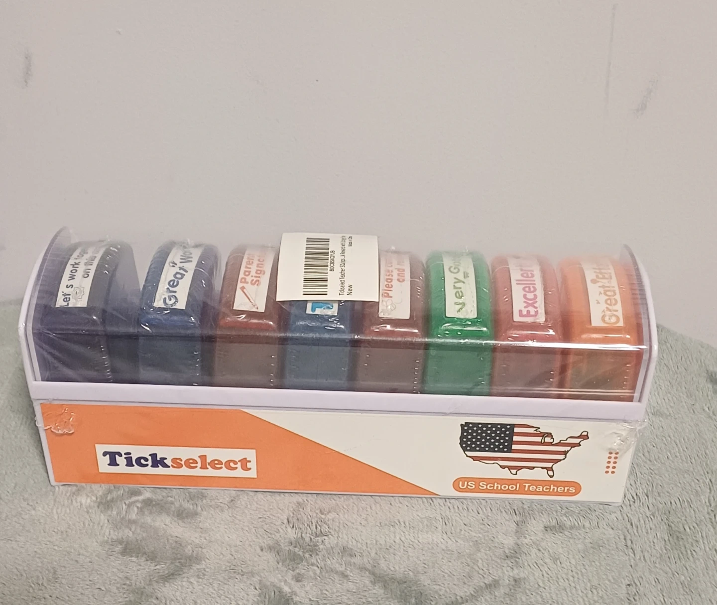 These Tickselect Teacher Stamps are brand new and ready to use! They come with a storage tray for easy organization. The stamps include messages like 'Great Work', 'Parent Signature', 'Very Good!', and 'Excellent!'