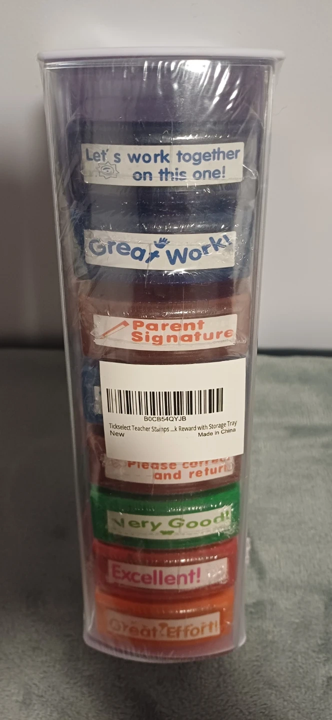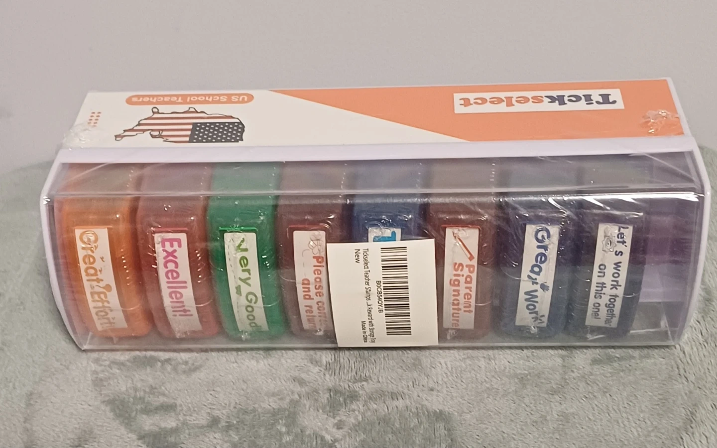 These Tickselect Teacher Stamps are brand new and ready to use! They come with a storage tray for easy organization. The stamps include messages like 'Great Work', 'Parent Signature', 'Very Good!', and 'Excellent!'