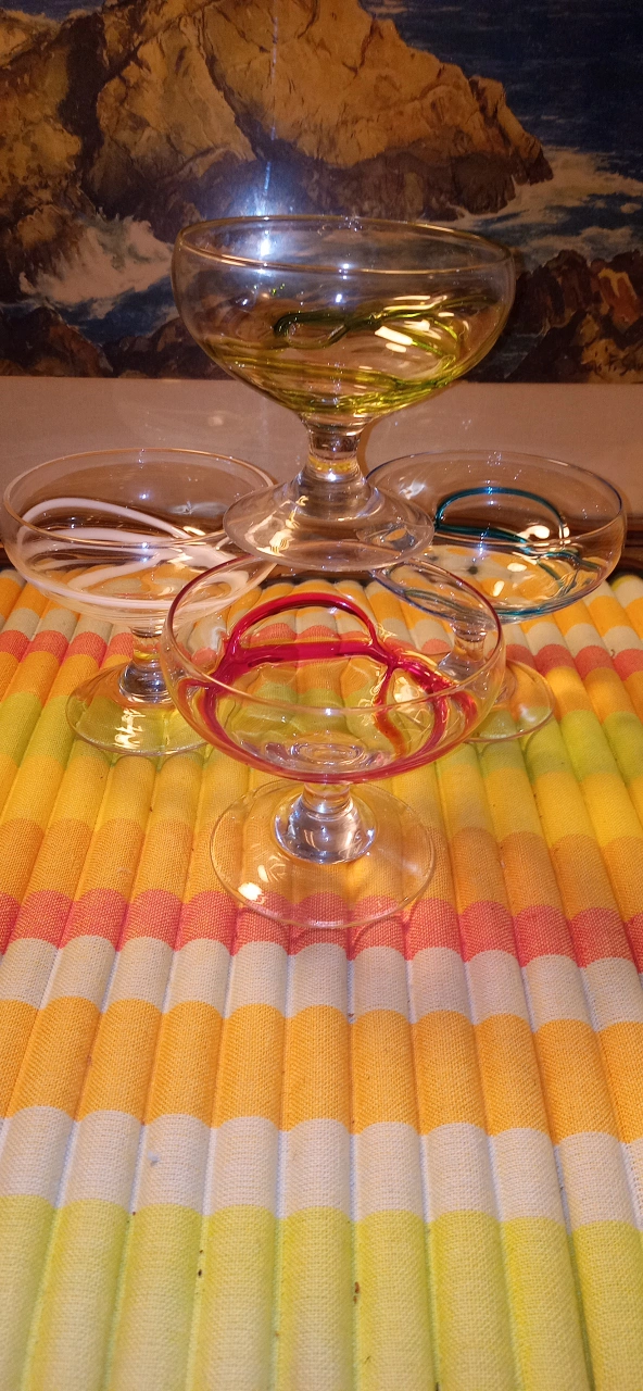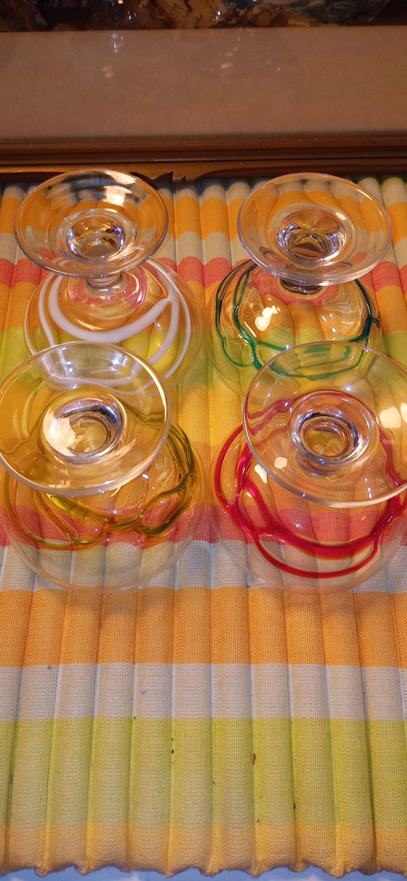 131Selling a set of 4 vintage dessert cups. They're made of clear glass with colorful swirl designs inside. Each cup is about 4 inches in diameter. Perfect for adding a touch of fun to your dessert presentation!