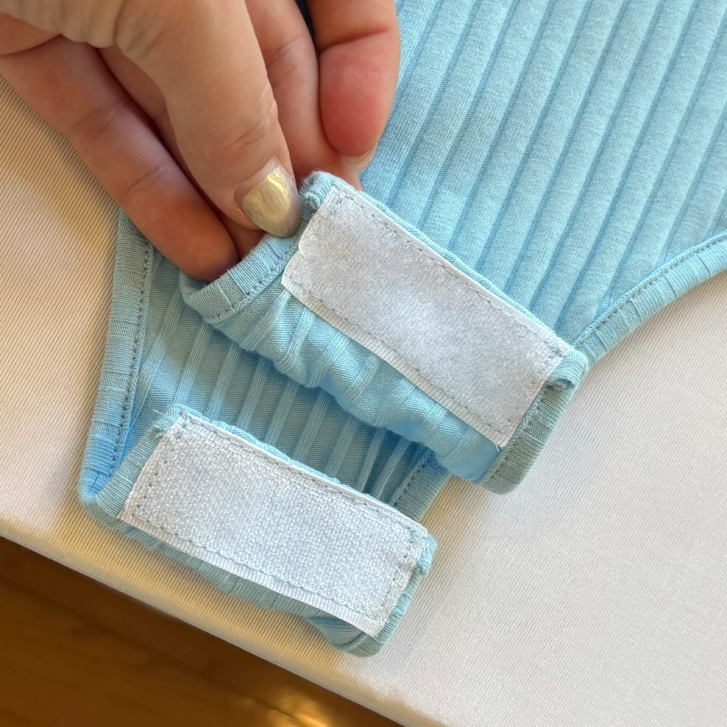 This Zaful bodysuit features a flattering racerback and soft, wide ribbed fabric in a beautiful light blue hue. It has thin spaghetti straps and a hook and loop closure at the gusset. This piece is perfect for layering or as a simple, chic top for spring and summer outfits.