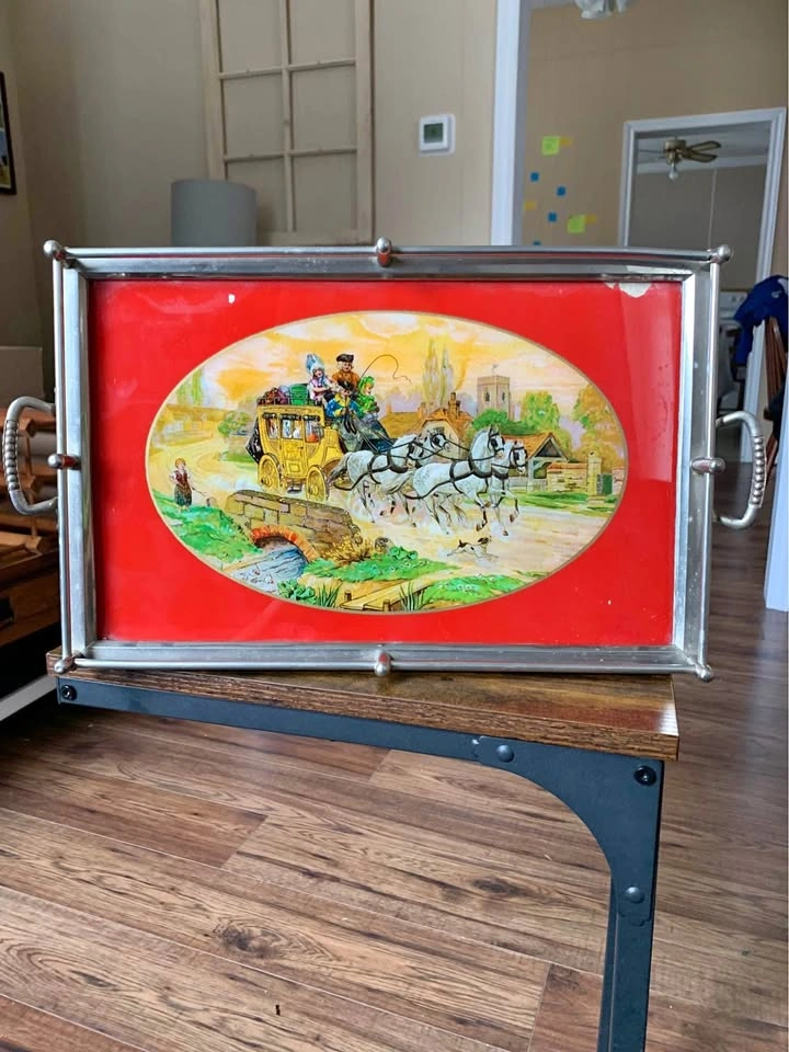 Buy & SellVictorian Era Reverse Painted Foil Art Serving TrayVictorian Era Reverse Painted Foil Art Serving Tray$50Reverse painted on glass, with foil background, 4-horse drawn carriage, 18” long handle to handle X 10” wide.WHERE TO MEETCheck LocationView MapSELLERverifiedJulieNew Hamburg600 reviews0 chats·0 favorites·2 views