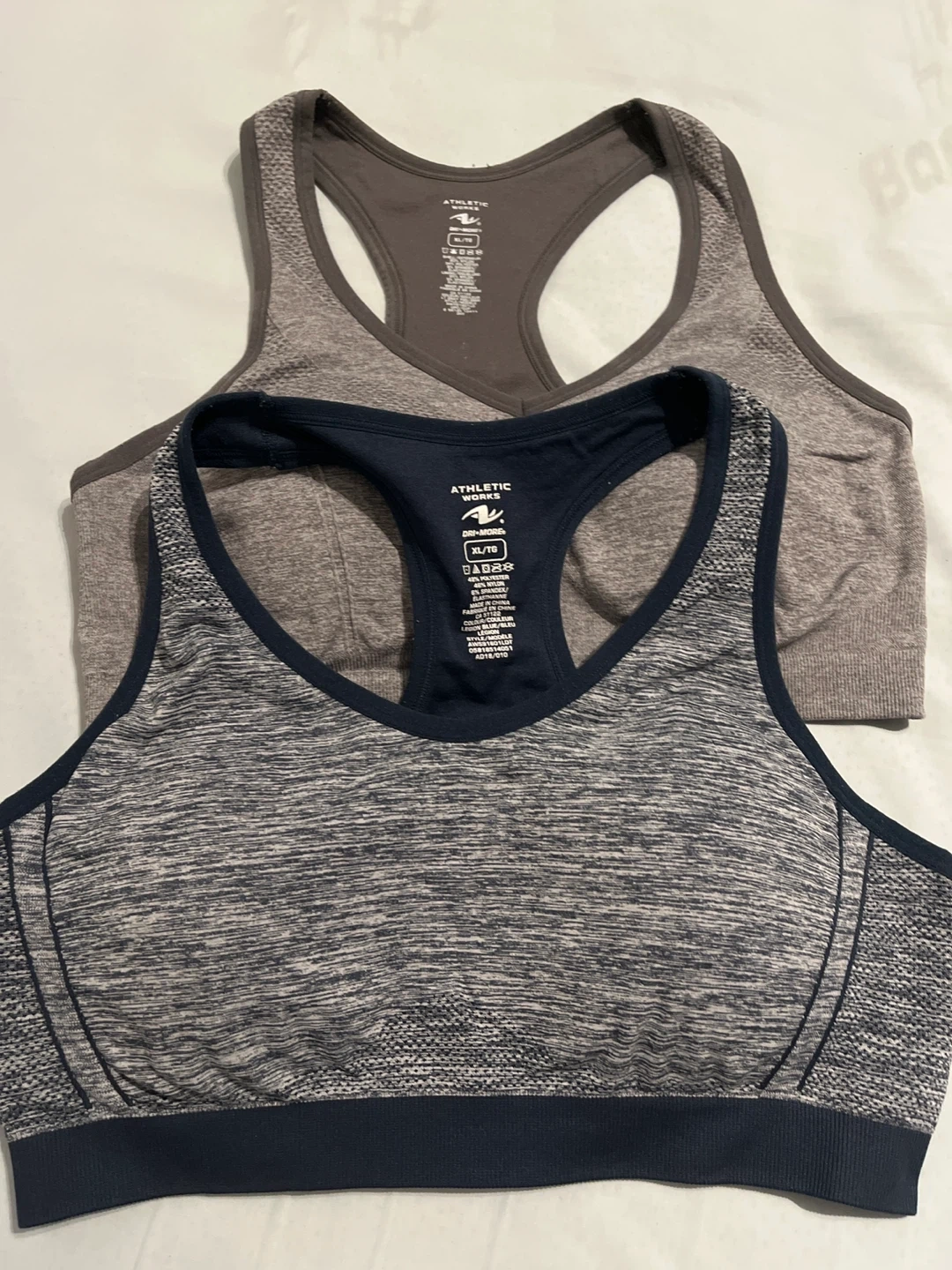 Selling two Athletic Works sports bras in excellent condition. One is a grey/brown colour and the other is a blue/grey colour. Both are size XL. Perfect for workouts or everyday wear!