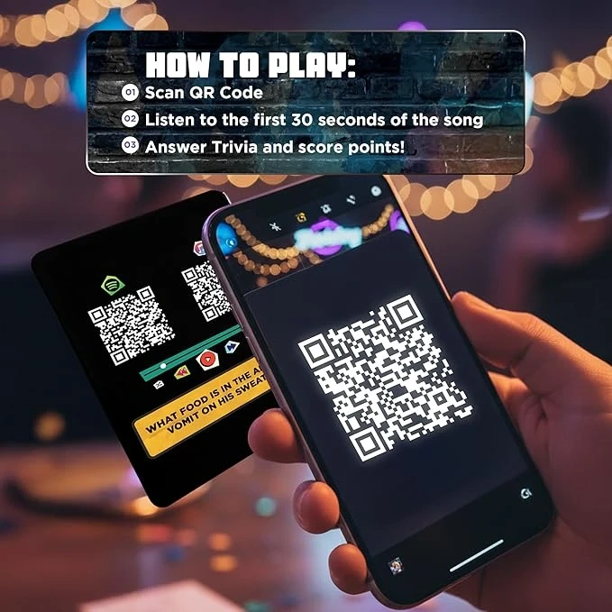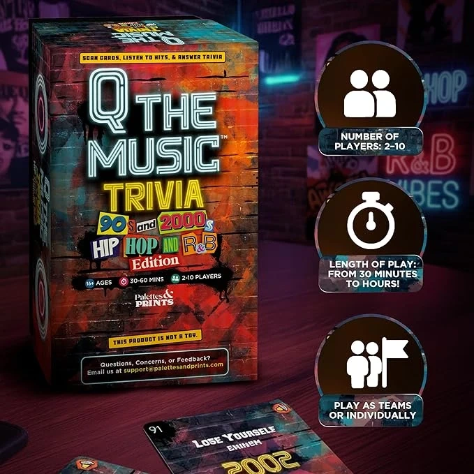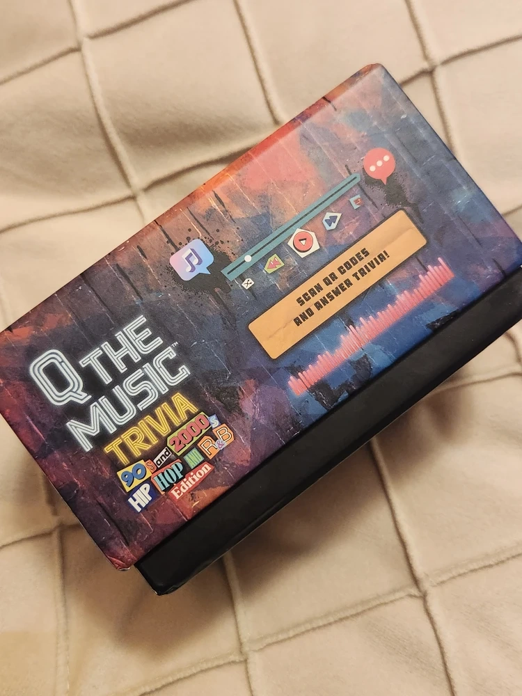Selling a Q The Music Trivia game! It's the 90s and 2000s Hip Hop and R&B edition. Great for 2-10 players, and each game lasts about 30-60 minutes. Scan the cards, listen to the hits, and answer trivia!