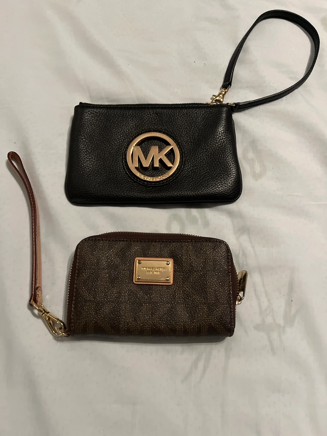 Selling two Michael Kors wristlets! One is black with the MK logo, and the other is brown with a zip-around closure. Both are in great condition and perfect for carrying your essentials.