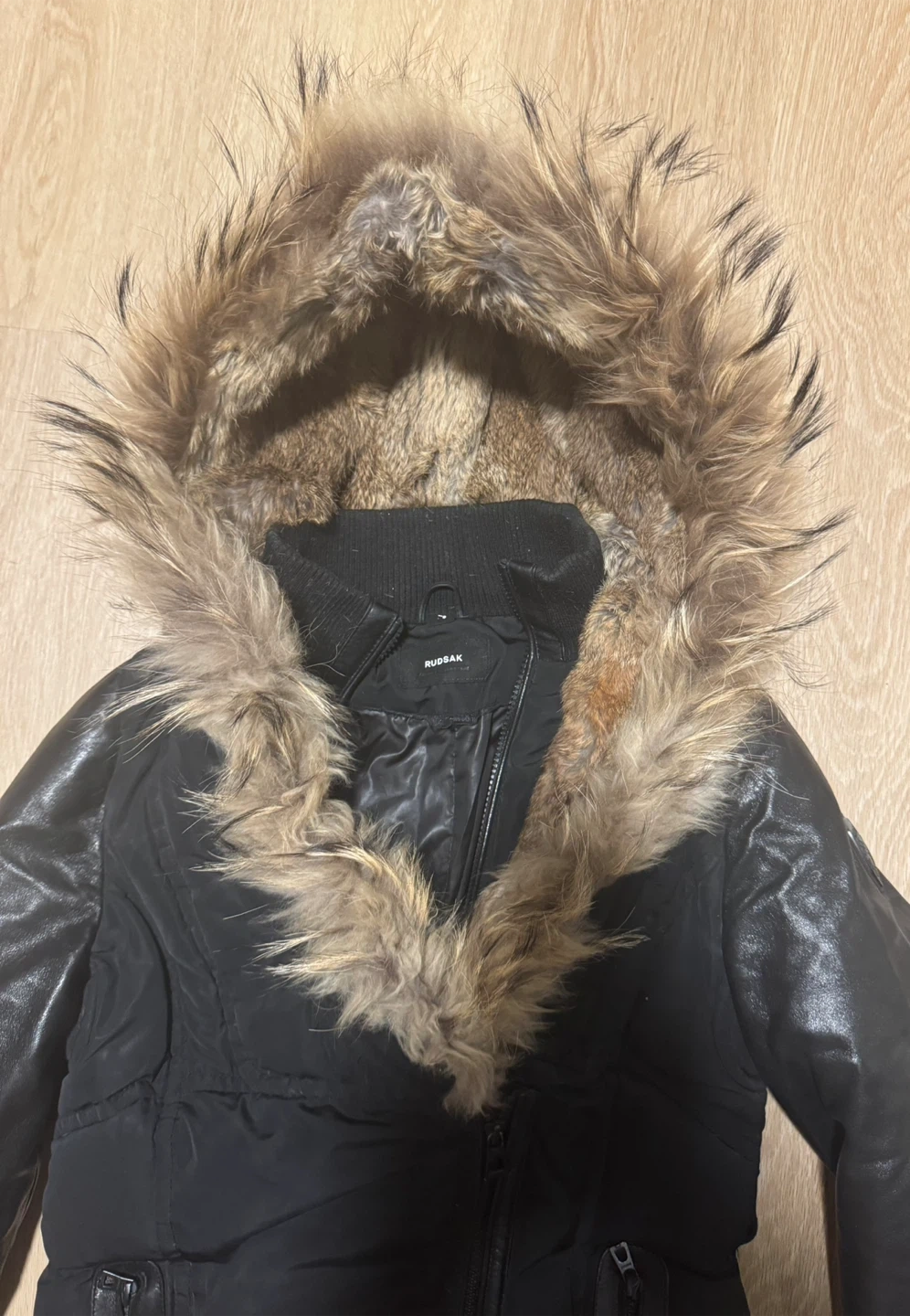 Selling a Rudsak Colatina black down jacket with leather sleeves and a real fur trim hood. There are some signs of wear, as shown in the pictures.