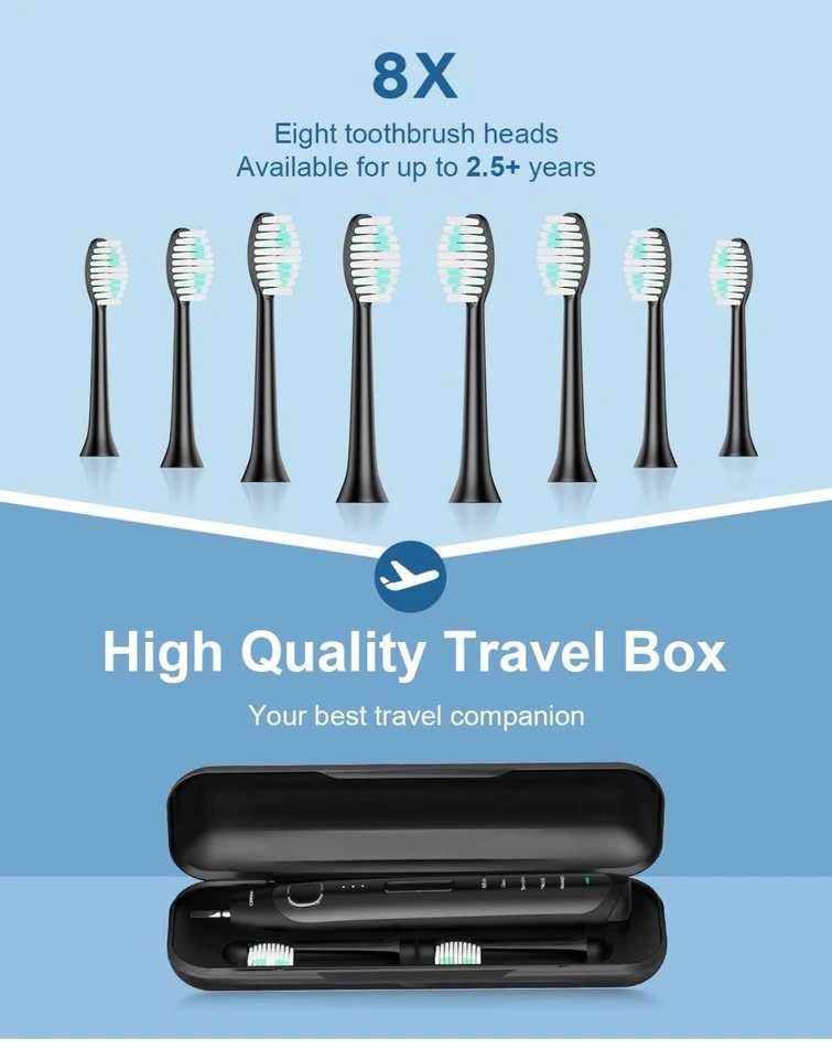 Electric Toothbrush for Adults and Kids Sonic Rechargeable Toothbrush with 5 Modes 2-Min Smart Timer IPX7 Waterproof 40,000 VPM Motor with 8 Brush Heads & Travel Case Black