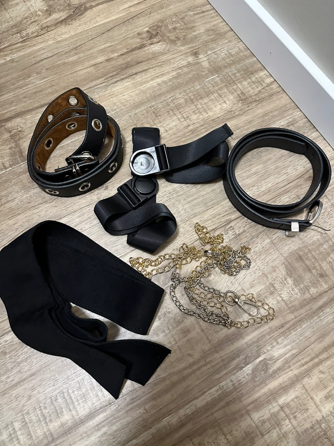 Selling a collection of belts and chains! There's a variety of styles, including a classic black belt, a grommet belt, a wide black fabric belt, a seatbelt style belt, and some decorative chains. They're all in good condition and ready to add some flair to your wardrobe