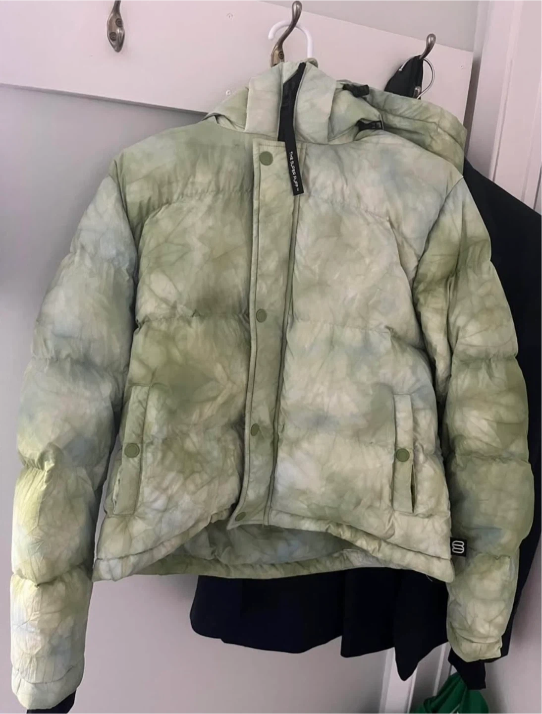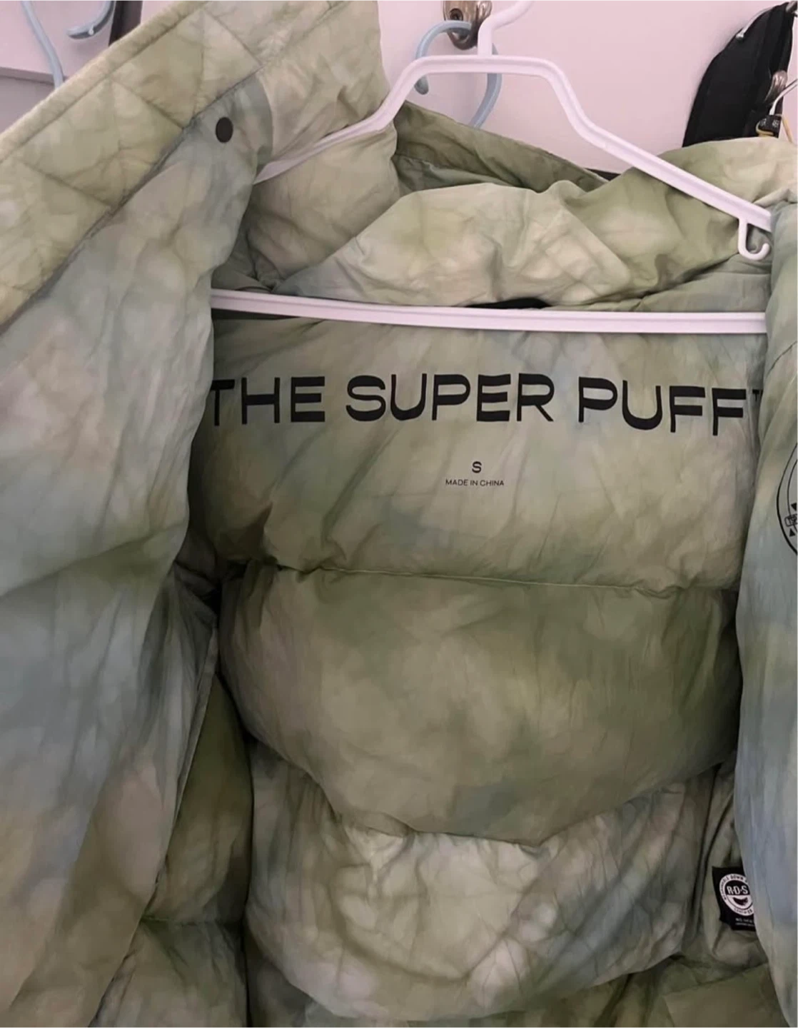 Selling Aritzia The Super Puff jacket in a unique tie-dye pattern! It's a size small and features a hood. There's a small stain on the jacket, as shown in the last picture. This jacket is designed in Canada and features 700+ fill power for superior warmth with less weight.