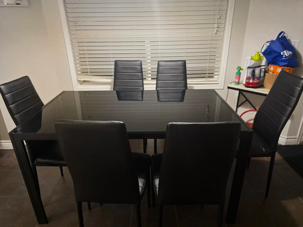 Selling a set of six dining chairs! They're in great shape and would look fantastic in any dining room. The chairs are black and have a modern design. Perfect for family dinners or entertaining guests