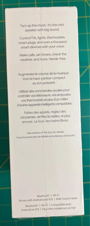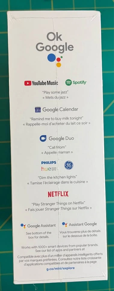 Box includes: Nest Mini (2nd gen), power adapter, quick start guide – all unopened.