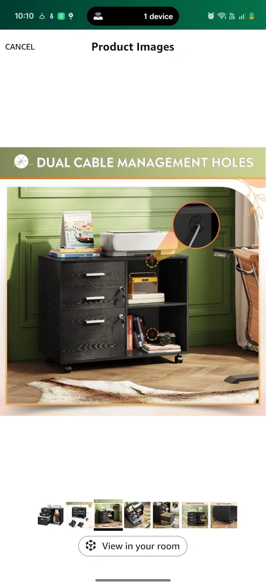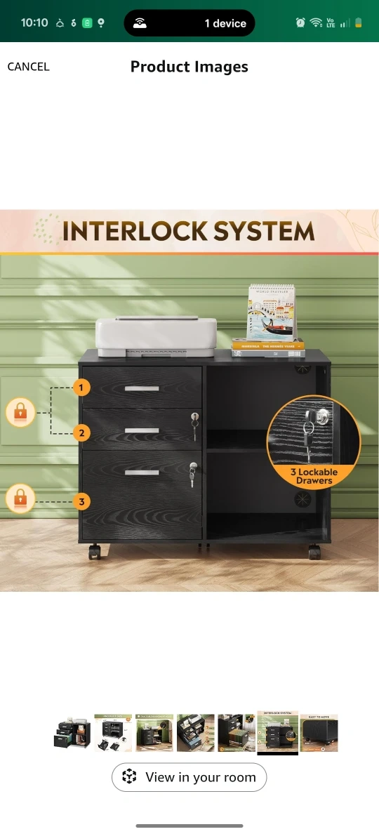 This black wood filing cabinet is great for keeping your office organized! It features an interlock system and three lockable drawers for secure storage. There are also dual cable management holes to keep your cords tidy.