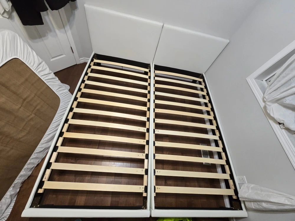Selling 2 single-size bed frame in great condition! It's a simple design and would look great in any bedroom. The frame is a neutral white colour and has a padded headboard. It's very sturdy and easy to assemble. If you're looking for a bed frame, this is a great option!