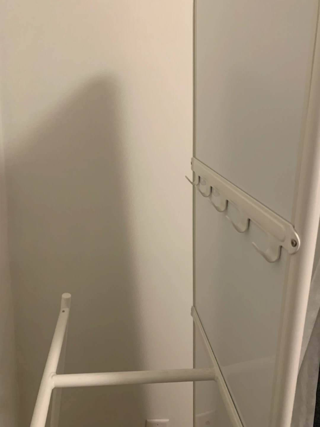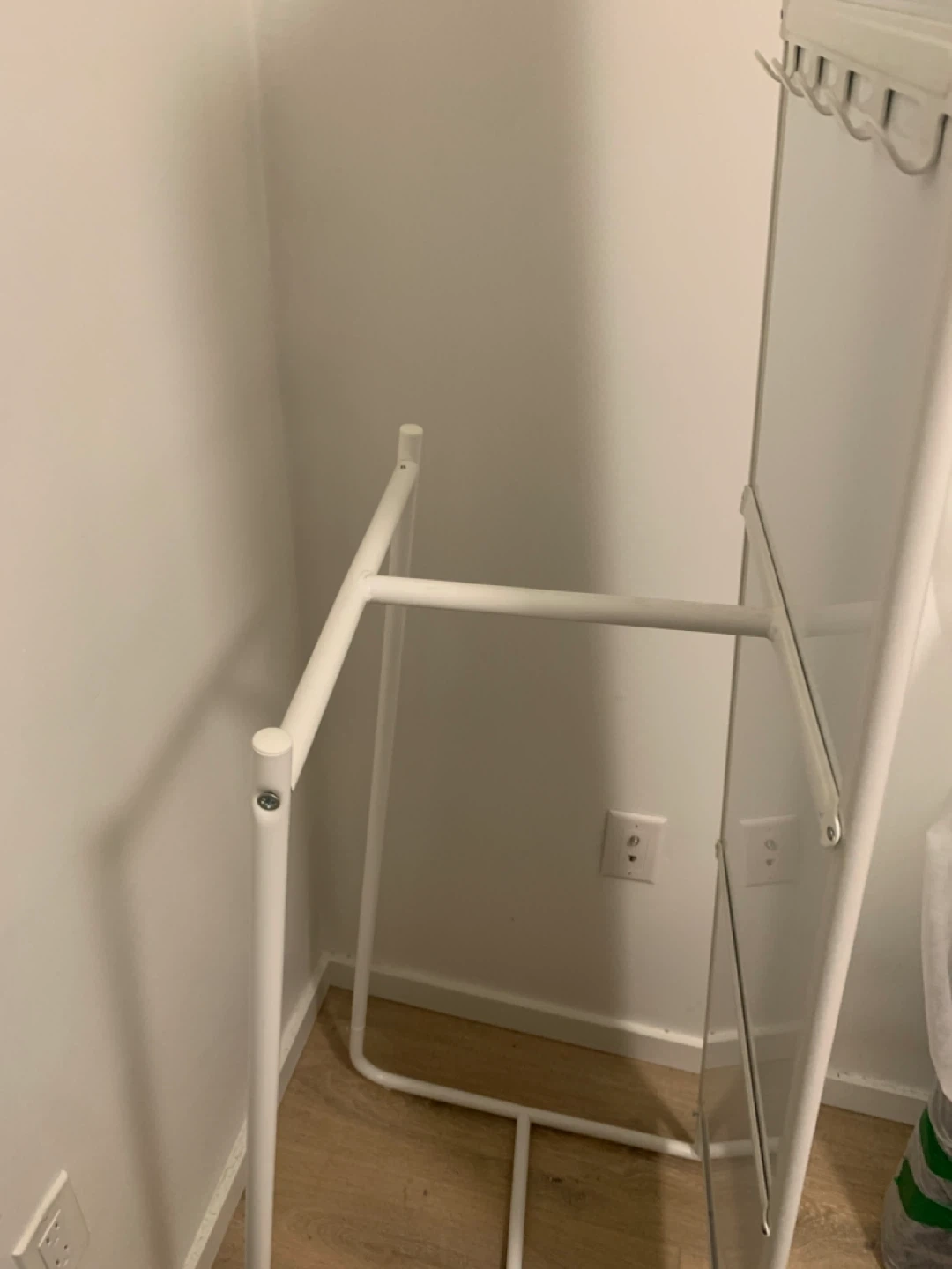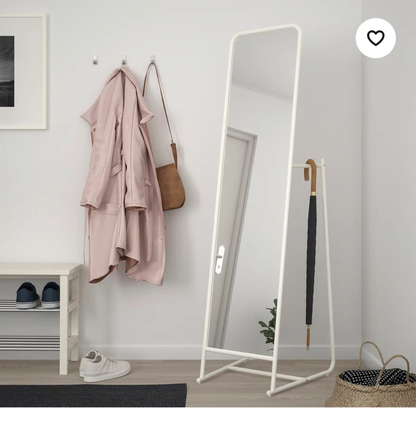 Selling an IKEA KNAPPER standing mirror in white! It's in great condition and ready to brighten up your space. This mirror is perfect for bedrooms, dressing rooms, hallways or anywhere you need a full-length reflection & extra storage with hooks & a bar for hanging items.