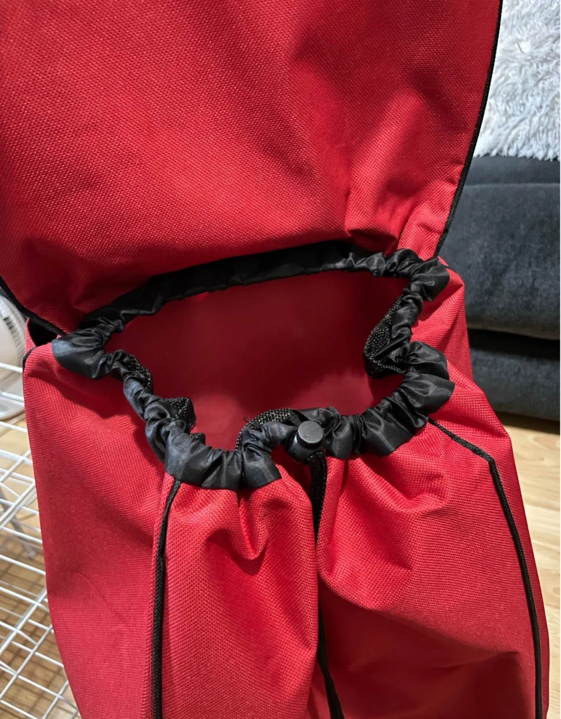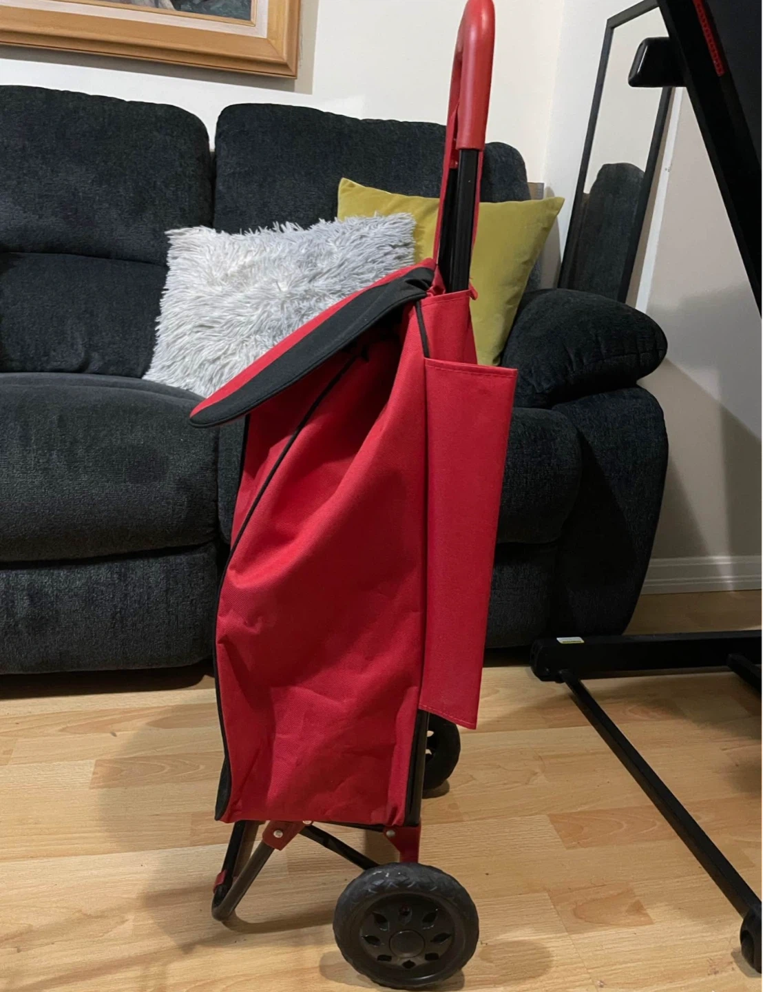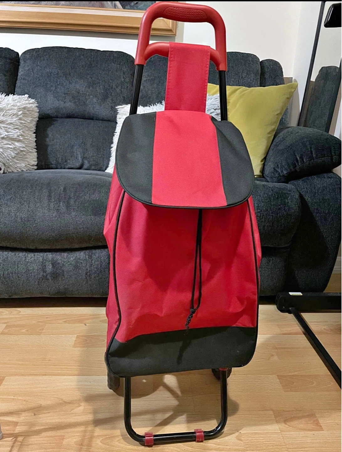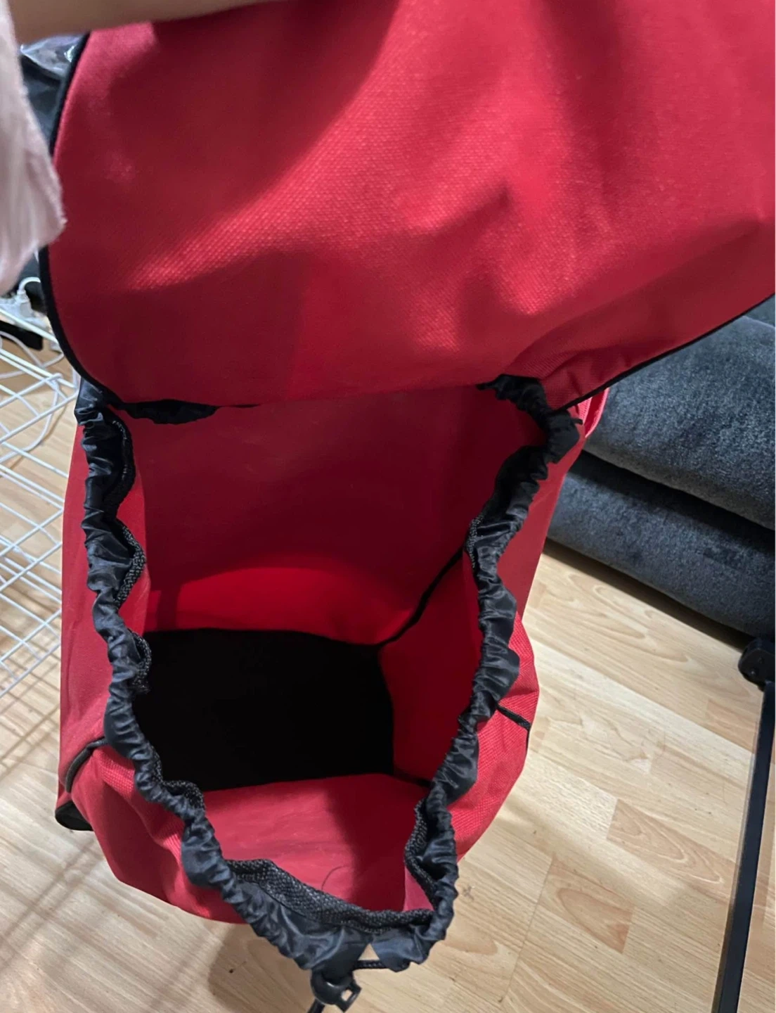 22Selling a red shopping trolley cart. It's in great condition and ready to help with your grocery runs! The bag is red with black accents and has a drawstring closure