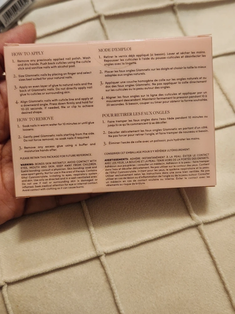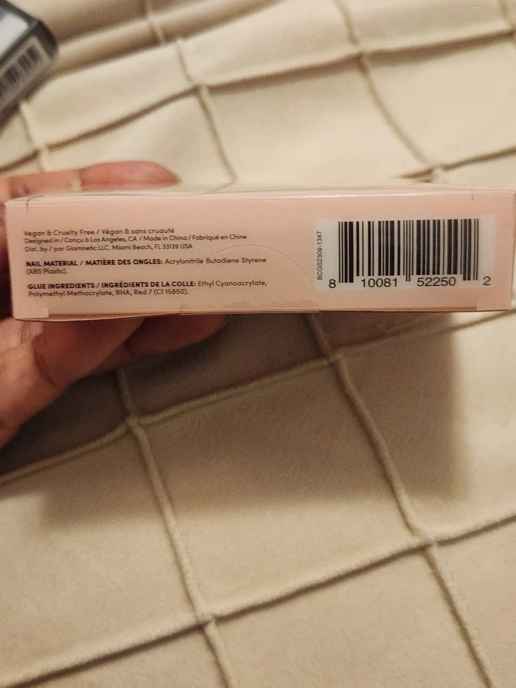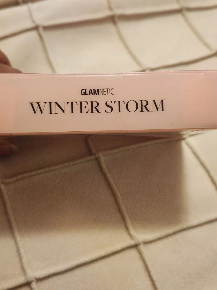 These are Glamnetic press-on nails in the Winter Storm Short Almond style! They are vegan and cruelty-free. Included are 30 nails, nail glue, a nail file, a cuticle stick, and an alcohol pad.