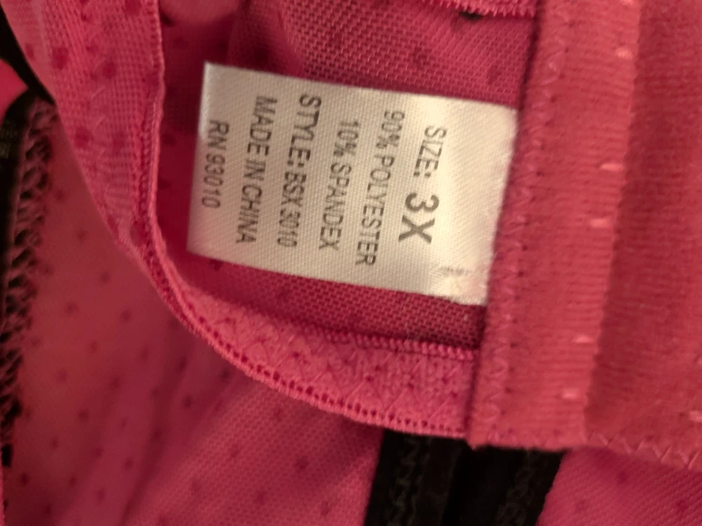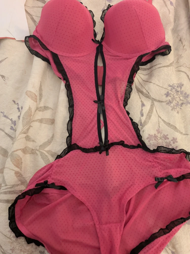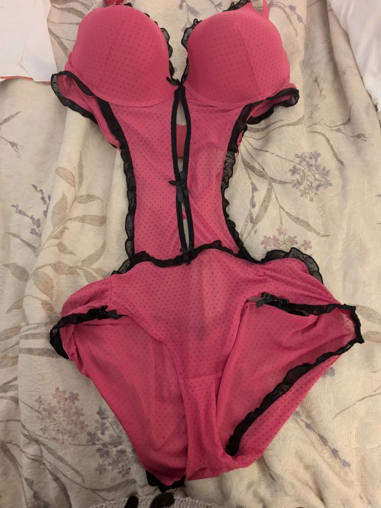 80Selling a cute pink bodysuit with black polka dots and frilly trim! It's a size 3X and made of 90% polyester and 10% spandex A size 3x that fits more like a 2X