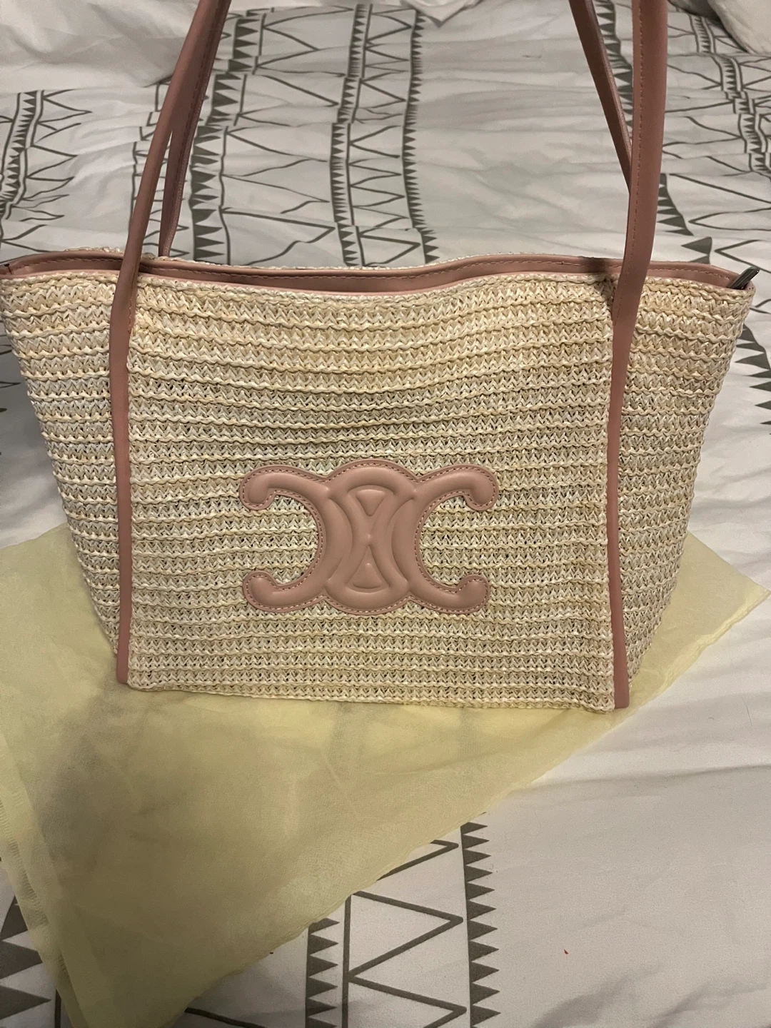 Selling a Celine small basket bag in raffia and calfskin. It's in great condition and perfect for summer! The bag has a beautiful woven texture with pink leather trim and the iconic Celine logo on the front