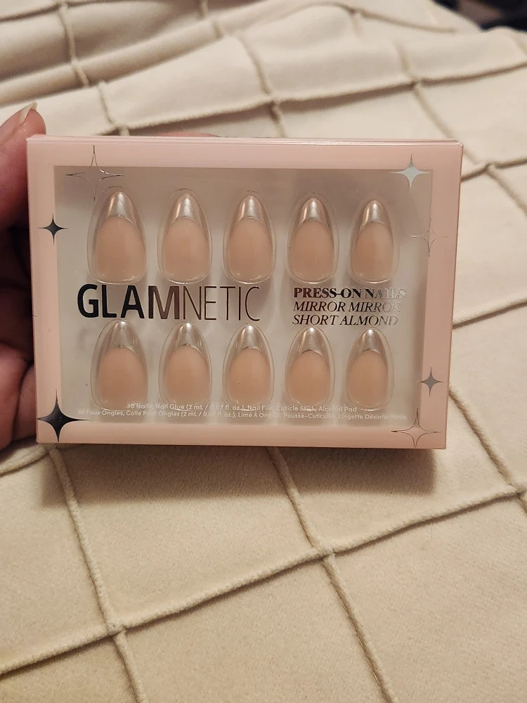 Selling a set of Glamnetic press-on nails in the Mirror Mirror Short Almond style! These nails apply in seconds and are reshapable for the perfect fit. Enjoy a seamless application and nails that last up to 2 weeks. They're also vegan and cruelty-free