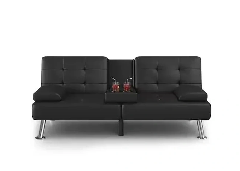 Black Faux Leather Futon Sofa Bed with Cup Holders - NEW
