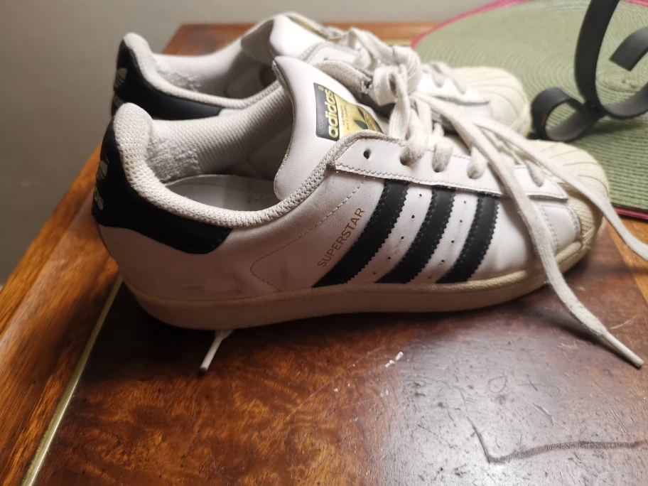 Selling a pair of classic Adidas Superstar sneakers in white with black stripes. They are in used condition, but still have lots of life left! Size US 6.5