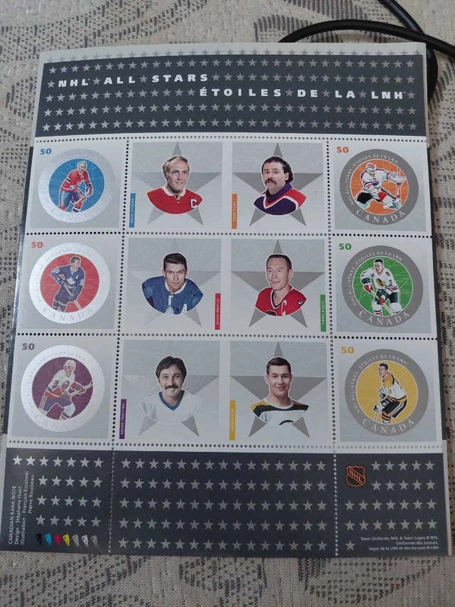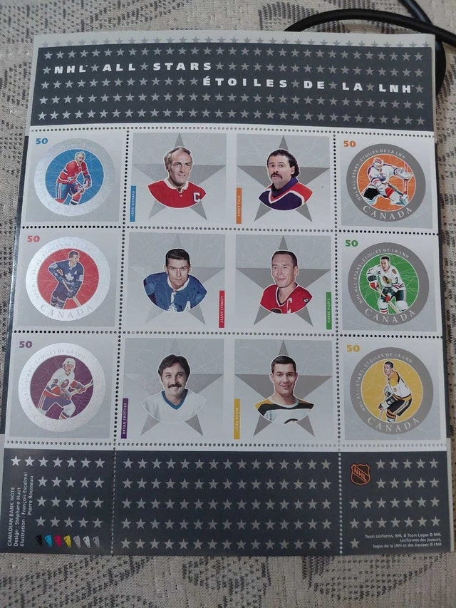 Own a piece of hockey history with these NHL All-Stars stamps! This sheet features legendary players and iconic logos from the NHL All-Star games. It is in used condition. Add this to your collection or give it as a gift to a hockey fan! It's in good condition for its age. Don't miss out on this chance to own a unique piece of sports memorabilia!