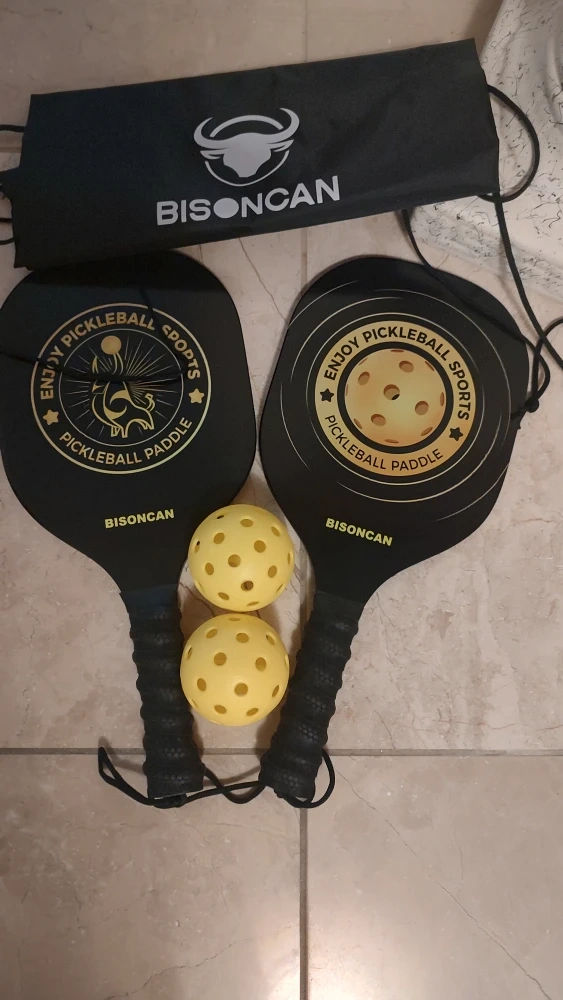 Get ready to enjoy some pickleball with this Bisoncan set! It includes two paddles, two balls, and a convenient carrying bag. Perfect for some fun in the sun!
