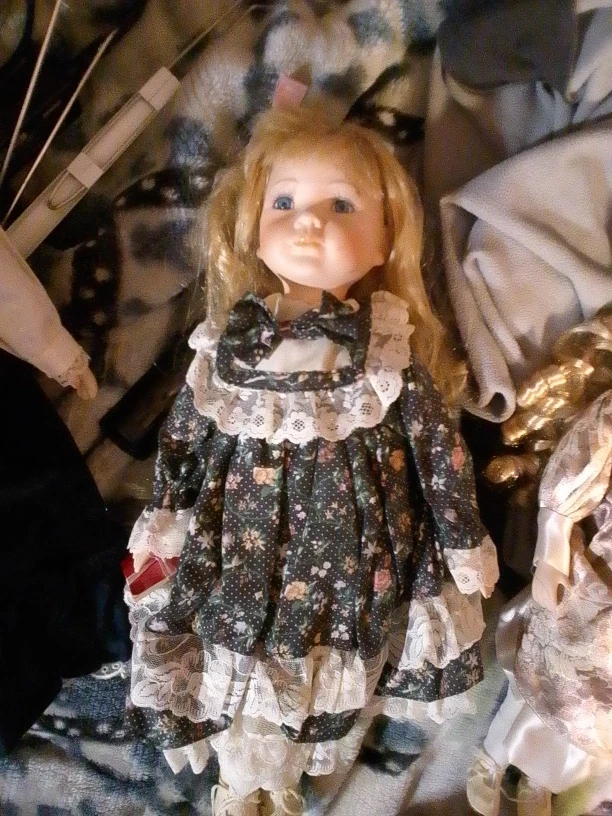 A lovely porcelain doll with a floral dress and lace detailing. It's in good condition and would make a great addition to any collection