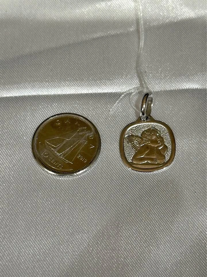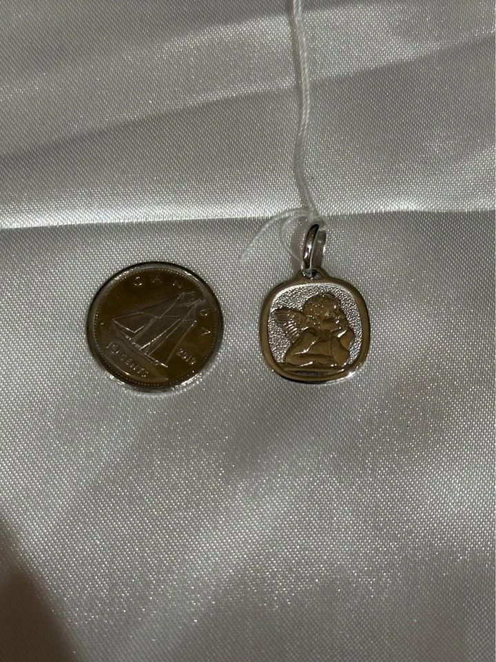 18k solid white gold angel pendant. 1.64 grams. Dime included in photo for size comparison.
