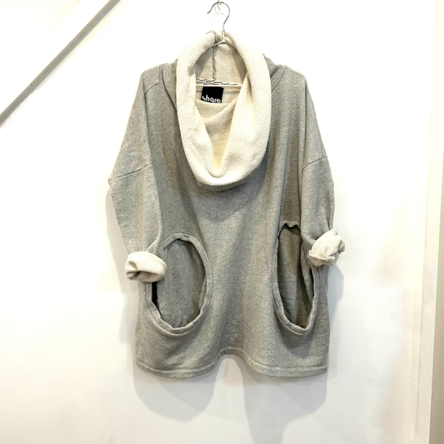 Cozy and stylish Share Lover's tunic sweater! This grey sweater features a unique design with a cowl neck and convenient pockets. Perfect for layering or wearing on its own for a relaxed, fashionable look