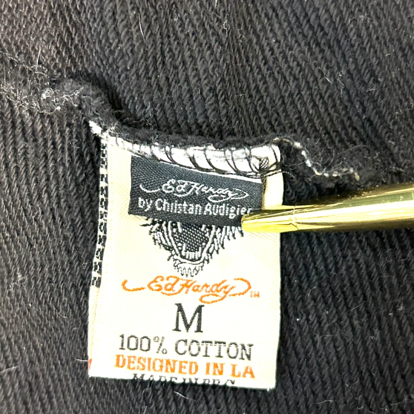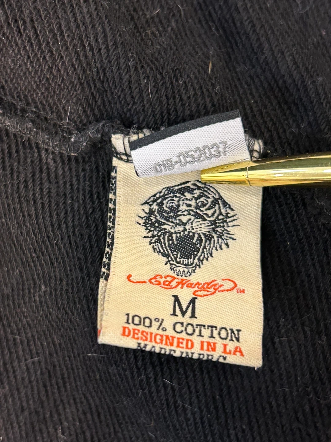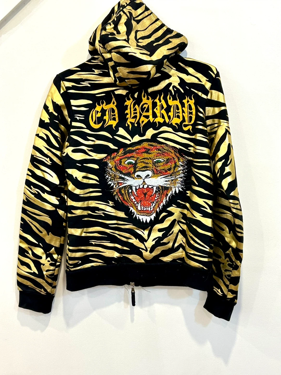 Rare Y2K Christian Audigier for Ed Hardy hoodie with a striking tiger print. The hoodie is a size M and features a unique design with rhinestones and gold detailing. Made from 100% cotton, it's comfortable and stylish. Perfect for adding a bold statement to your wardrobe!