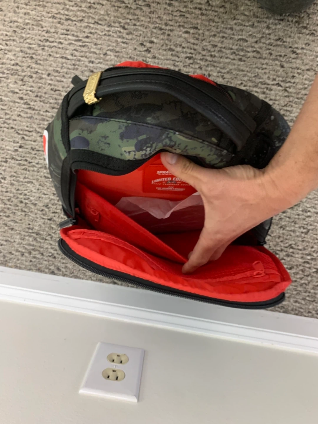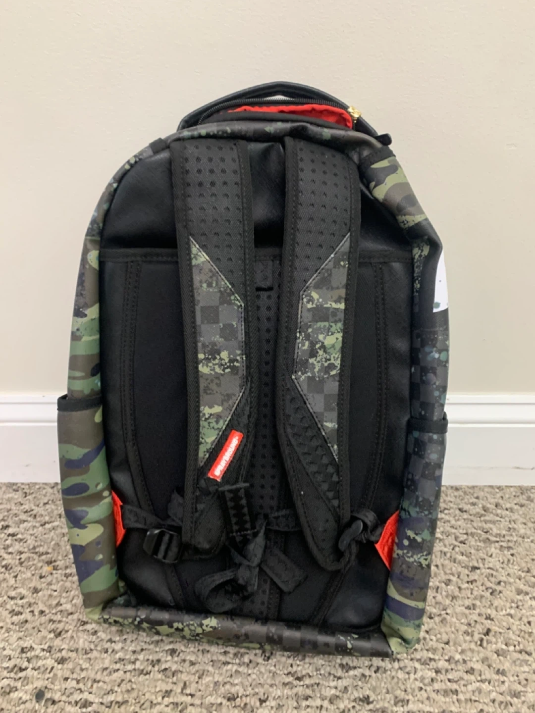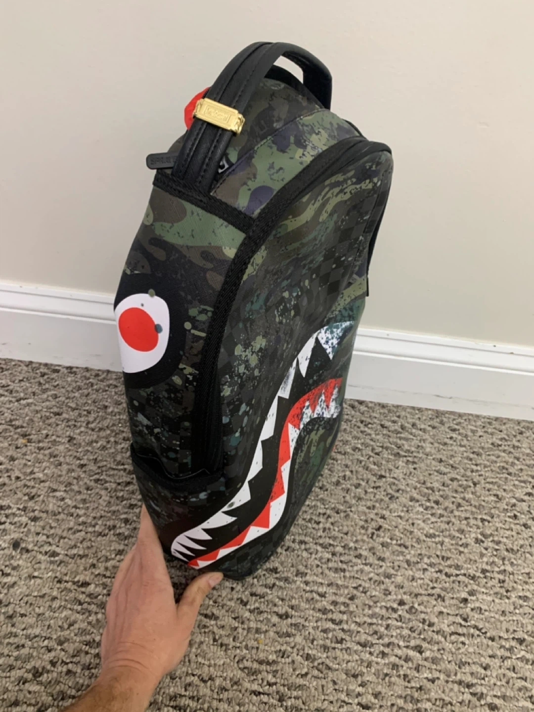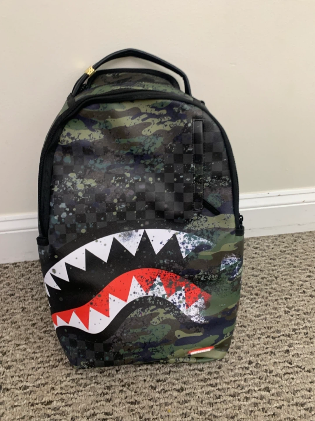Selling a Sprayground Limited Edition backpack! It features a cool camo pattern with the iconic shark mouth design. The interior is a bright red colour. Great for school, travel, or just showing off your unique style